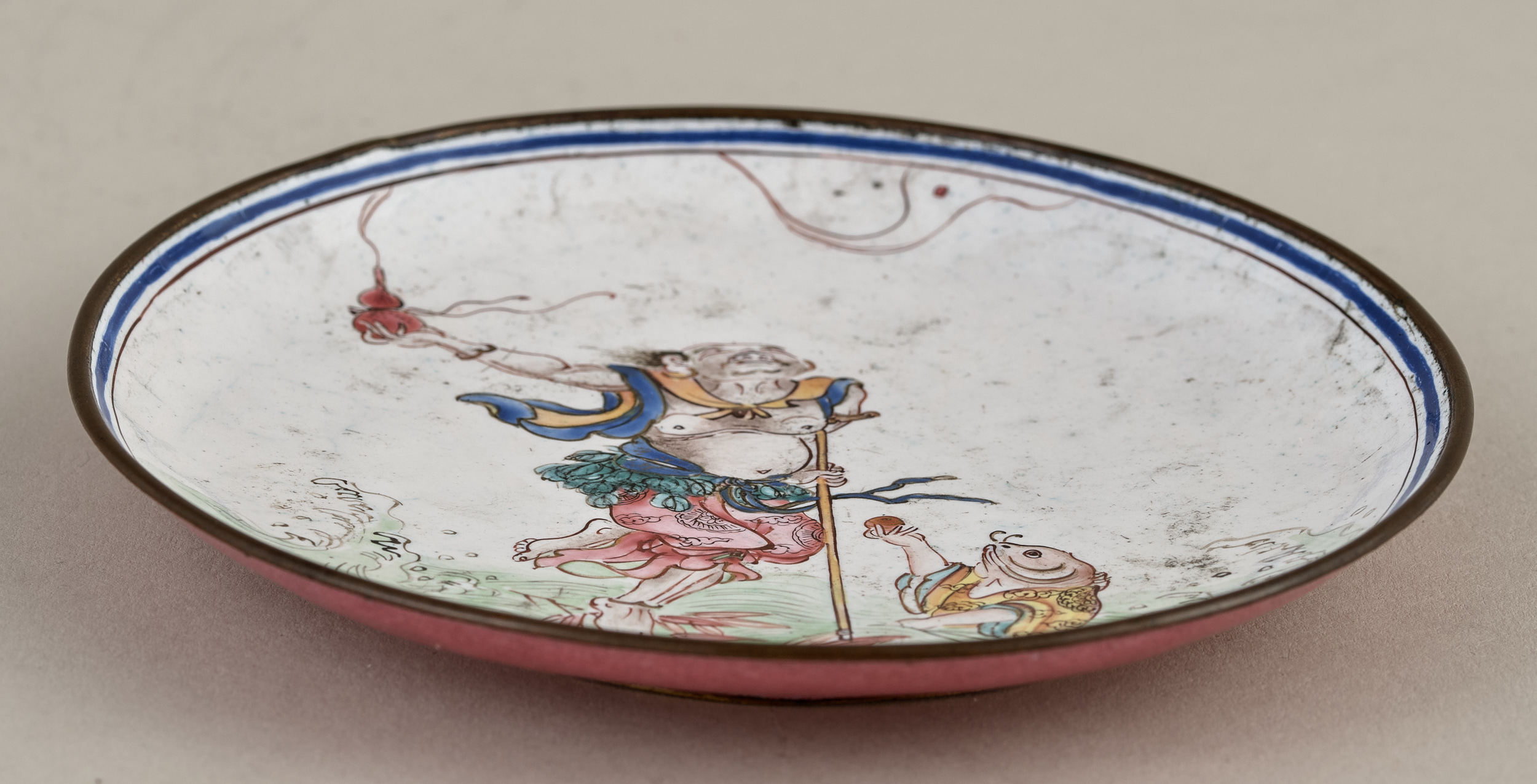 Talerzyk miedziany pokryty białą emalią w typie falangcai, określaną jako emalia kantońska w gamie barwnej famille rose. Pośrodku lustra przedstawiona jest stojąca na wodzie bogini Ho Hsien-ku a za nią morskie bóstwo z owocem zwanym „ręką Buddy|”. Na odwrociu otok talerzyka w kolorze rubinowym, dno białe z dwoma owocami brzoskwini „owocem Nieśmiertelnych”. Historia Ho często była pretekstem do ozdabiania przedmiotów użytkowych motywami z klasycznego tekstu z VII w. p.n.e. Przedstawiana podczas lotu lub lewitacji, z kwiatem lotosu lub koszem kwiatów lub darów lasu. Według dzieła literackiego postać ta urodziła się z sześcioma złotymi włosami. Jako nastolatka miała sen, w którym przyśnił jej się stary alchemik, objawiając jej przeznaczenie. Zdecydowała, że nie wyjdzie za mąż i odda swoje życie zgłębianiu filozofii tao. Ho Hsien-ku przeniosła się w góry i pościła, jedząc jedynie igły sosen. Potrafiła spać na zamarzniętej ziemi i lodzie. Swoją mądrością zdumiewała ówczesnych nauczycieli i mistrzów. Szybko zwróciła na siebie uwagę cesarzowej T’ang, która chciała poznać jej sekret, tajemnicę długowieczności, tak by móc rządzić do końca świata. Panna Ho wyczuła tę samolubną intencję. Kiedy pojawili się ludzie cesarzowej, aby ją pojmać, panna Ho pokryła swoje ciało robakami i udawała zmarłą. Żołnierze dali się nabrać i odeszli. Ho przeżyła w górach około 200 lat. Więcej czasu nie potrzebowała: jej ciało stało się na tyle lekkie, że niezauważalnie oderwało się od ziemi i poleciało do góry, do krainy nieśmiertelnych. Druga wersja legendy zakłada, że zjedzona przez nią masa perłowa zapewniła jej nieśmiertelność - stała się jedną z Ośmiu Nieśmiertelnych Taoizmu.