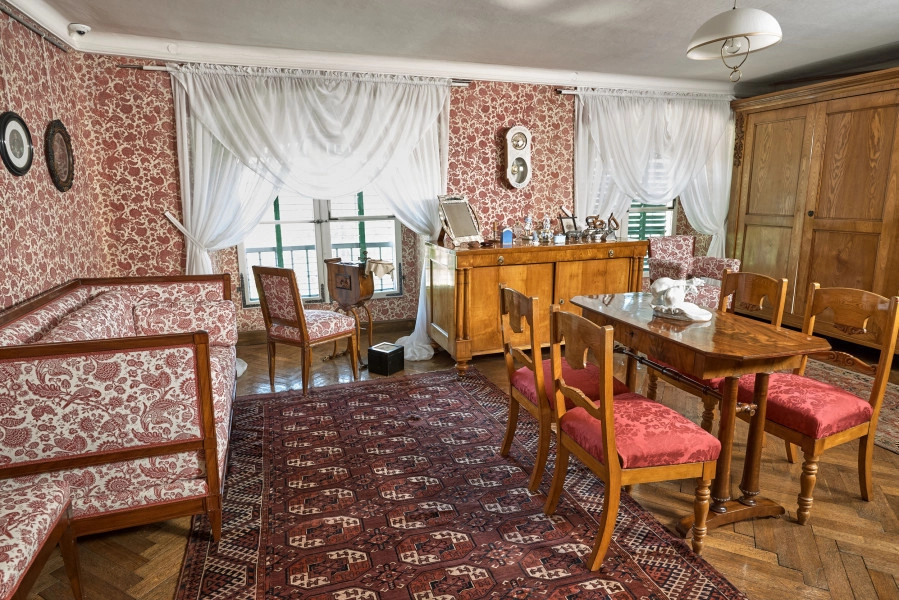 Pokój znajduje się w skrzydle północnym drugiego piętra zamku, ma rzut prostokąta zbliżonego do kwadratu. Pokój posiada dwa kwadratowe okna w ścianie północnej, zamknięte łukiem odcinkowym. W oknach umieszczono płotek o wysokości 1/3 ościeża i drewniane wiedeńskie żaluzje (?). Wejście do pokoju od strony południowej prowadzi z korytarza północnego przez mały przedpokój. Ścianę wschodnią, w całości, zajmują trzy segmenty drewnianej szafy garderobianej z trzema dwuskrzydłowymi drzwiami. W pokoju znajduje się piec murowany, tynkowany, dwukondygnacyjny z profilowanym gzymsem oraz umywalka z wodą bieżącą, pochodząca z czasu przebudowy zamku z przełomu XIX/XX w. Na ścianach wyklejono papierową tapetę z dekoracją roślinną i motywem papug w tonacji biało-czerwonej, pochodzącą z początku XX w. Na podłodze parkiet dębowy ułożony w jodełkę. W 1802 r. mieszkał w tym pomieszczeniu jeden z emigrantów francuskich, który ratując życie uciekł z Francji dzięki Pomocy księżnej Lubomirskiej. W połowie XIX w. pokój wchodził w skład Apartamentu Średniego. Za Romana i Elżbiety Potockich, w czasie wielkiego remontu, przy pokoju od strony południowej utworzono mały korytarzyk łączący II piętro z Ubieralnią Damską na pierwszym piętrze. Obecna aranżacja wnętrza pochodzi z lat powojennych.