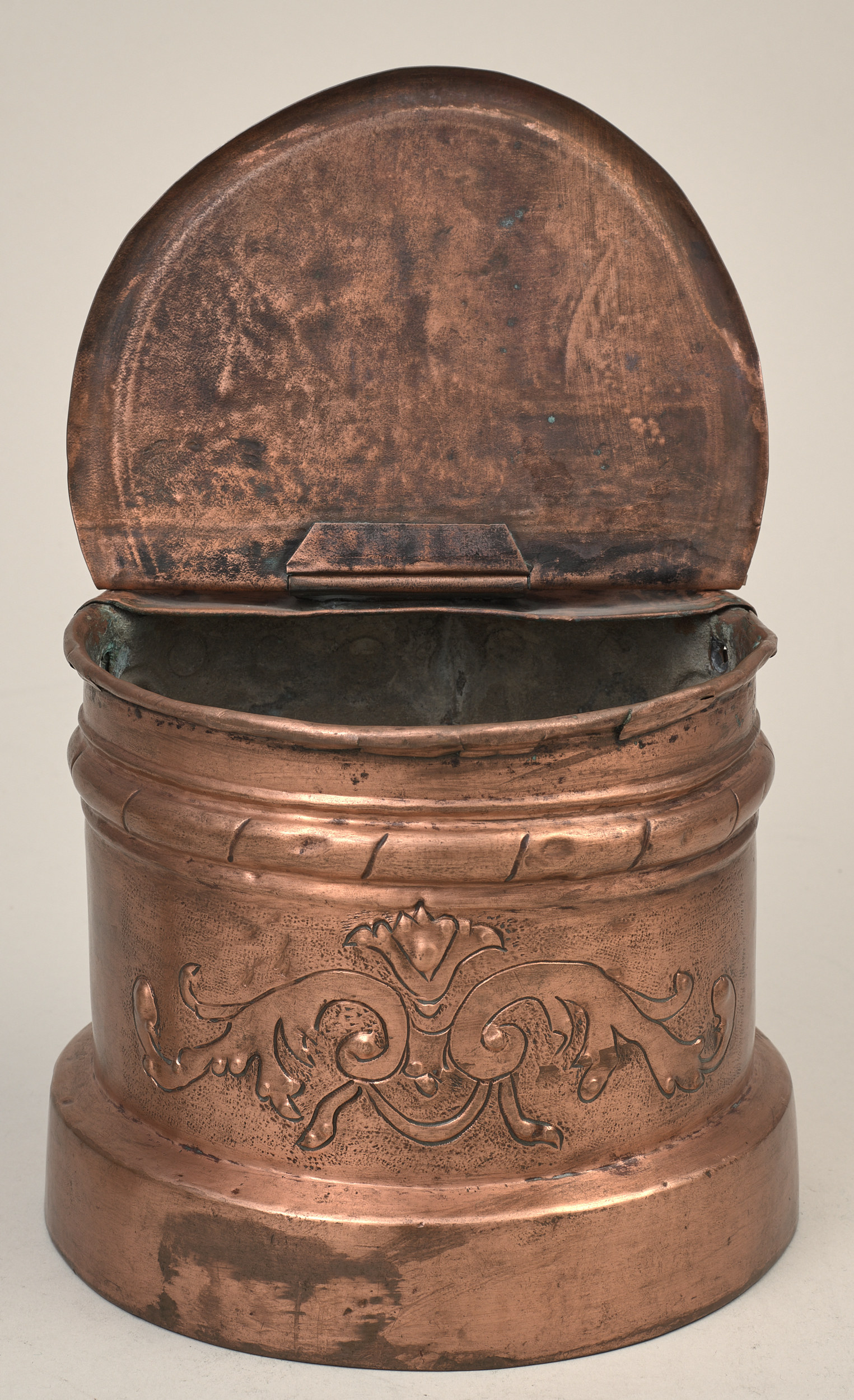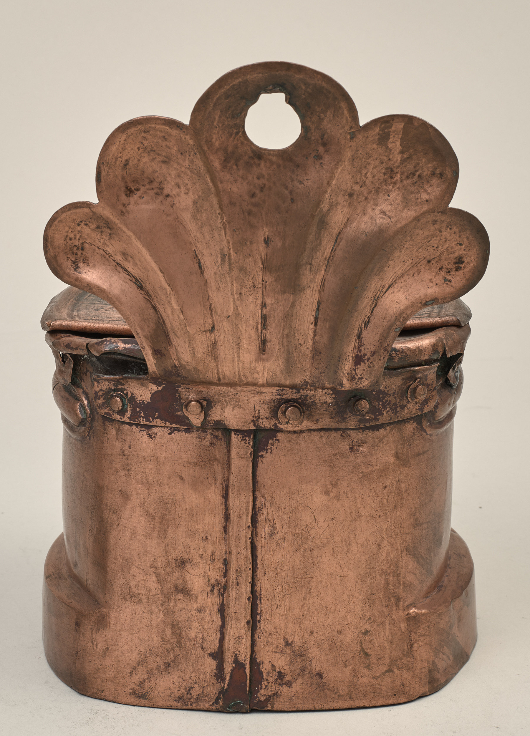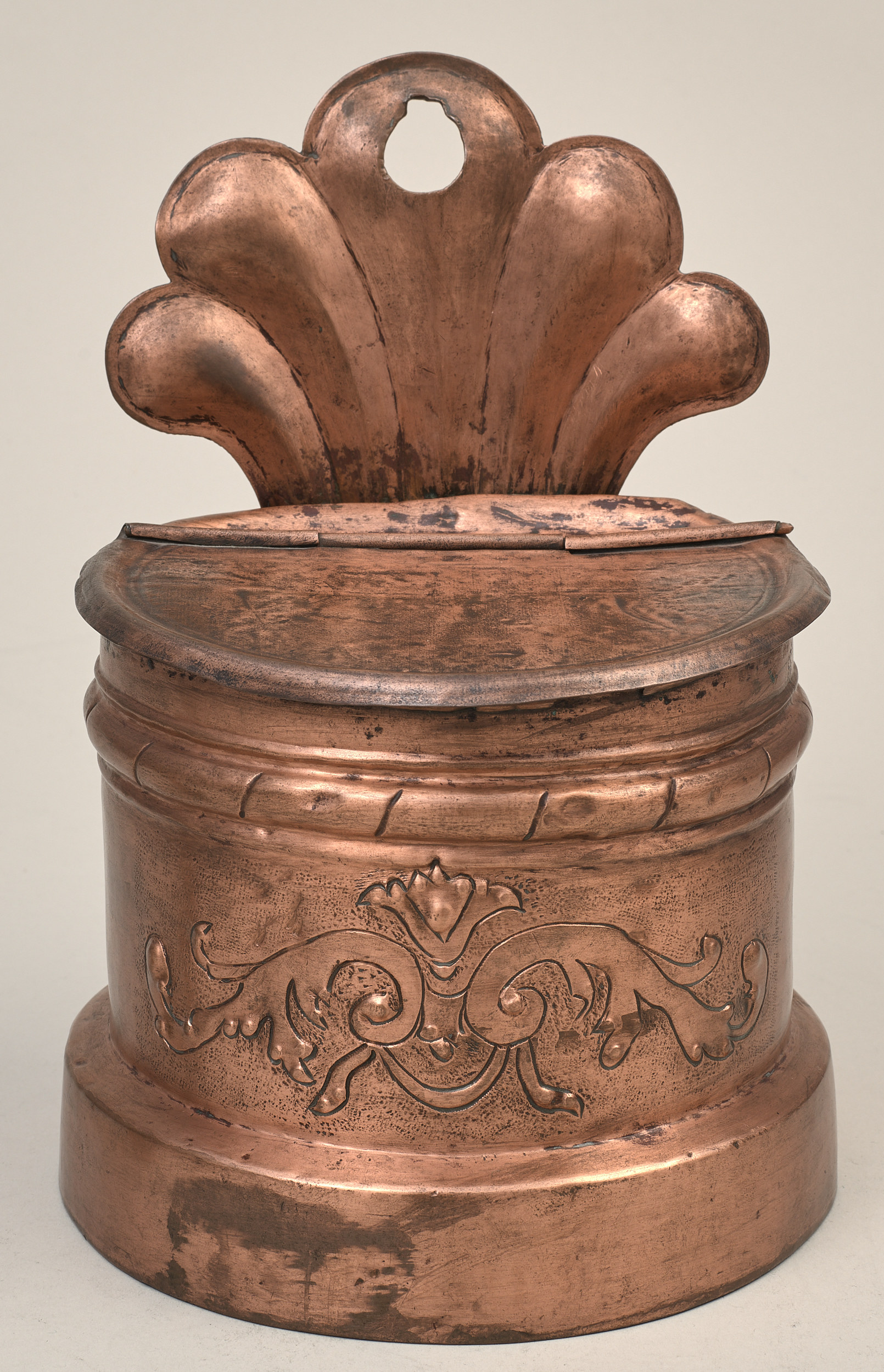 Solniczka wisząca, z kolekcji muzealnej, wykonana z blachy miedzianej, z końca XVIII wieku. Korpus – pojemnik o kształcie cylindrycznym, zamknięty u góry wieczkiem na zawiasie. U dołu korpus poprzez uskok przechodzi w okrągłą podstawę. Na tylnej ściance korpusu zawieszenie w formie palmety, z otworem do powieszenia na ścianie. Korpus ozdobiony rytym ornamentem wolutowo – okuciowo – roślinnym. Wewnątrz korpusu ślady po bieleniu czyli po cynowaniu. Bielenie – cynowanie było konieczne z uwagi na szkodliwe (trujące) właściwości czystej miedzi. Solniczka eksponowana jest na Korytarzu Wschodnim II piętra zamku, gdzie zgromadzone są wyroby z miedzi.