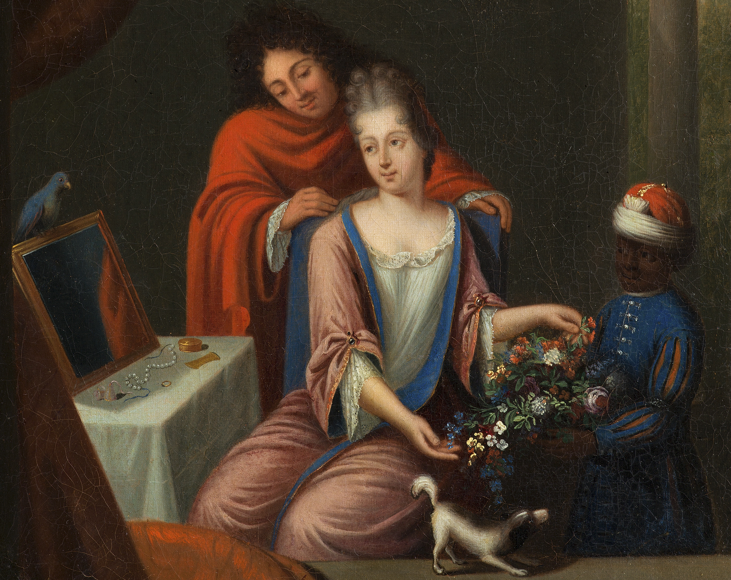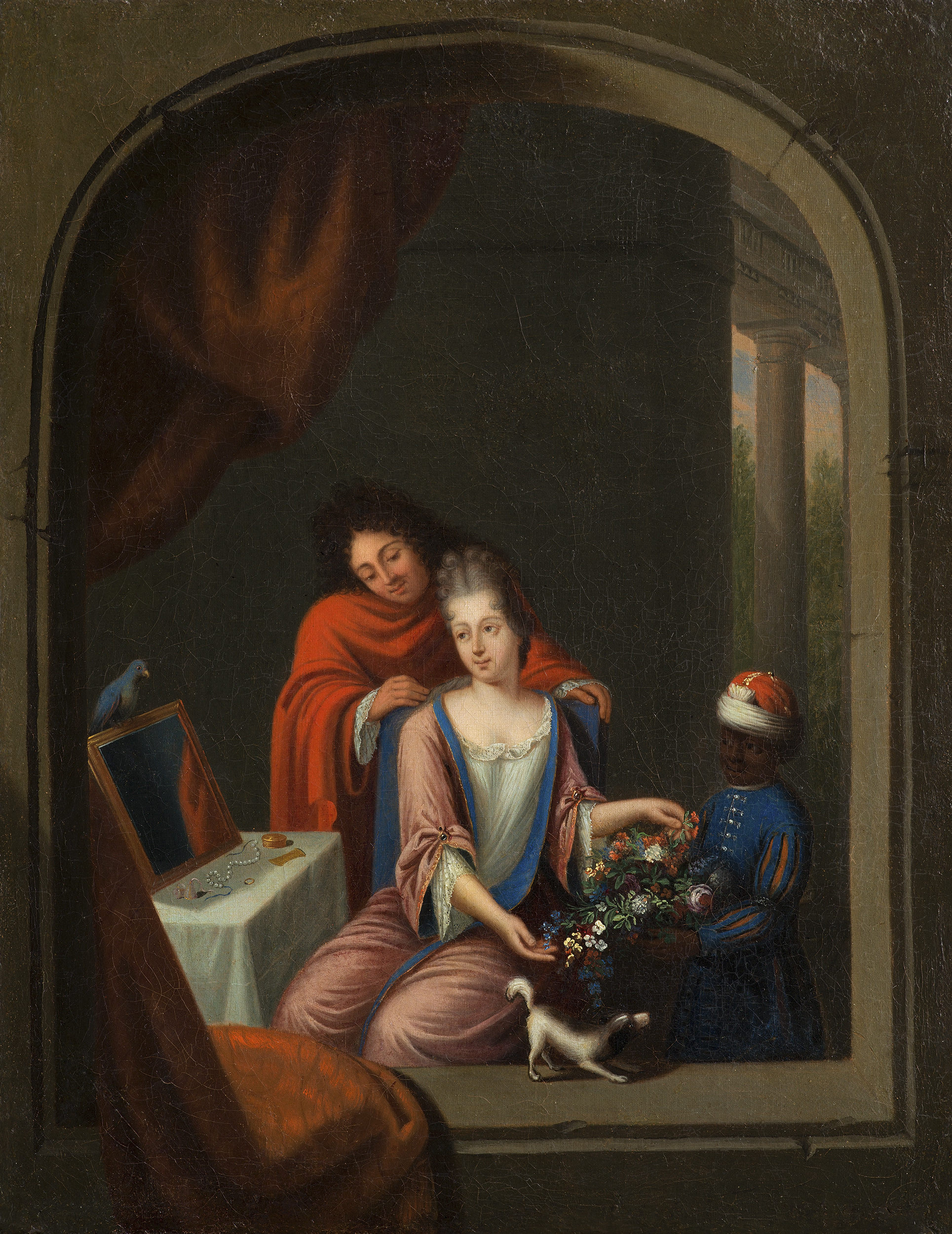 Dopiero gdy ogarniemy całość tej kompozycji, jesteśmy gotowi do odczytania znaczenia wszystkich jej drobnych elementów składowych. Na pewno scena rozgrywa się o poranku, gdyż główna jej bohaterka – dama – jest jeszcze w szlafroku. Sprawia ona wrażenie, jakby portretujący uchwycił ją w momencie chwilowego oderwania od monotonii czynności higieniczno-kosmetycznych. Gdy spojrzeć wnikliwiej, być może domyślimy się powodu tego rozproszenia, wybicia z codziennej rutyny znającej swe powinności patrycjuszki holenderskiej – wyjaśnieniem może być postać ubranego w czerwony płaszcz, z fryzurą a la lion mężczyzny opartego o zaplecek krzesła. Całkiem prawdopodobne, że jest on zalotnikiem, od którego pochodzą kwiaty przytrzymywane przez małego Murzynka w liberii i turbanie. Wydaje się szeptać jej do ucha słowa, których każdy rad słuchać. Rozanielona kobieta pieszcząc dłońmi płatki kwiatów, spoglądając w lustro zdaje się oddawać marzeniom. Na toaletce – obok porozrzucanej biżuterii - papuga, zaś na oknie częściowo przysłoniętym czerwoną zasłoną – szczekający piesek. W tle za kolumnadą rozciąga się widok ogród. Kompozycja jest przemyślana, rysunek poprawny jednak brak swobody pędzla nie sprzyja powstaniu arcydzieła.