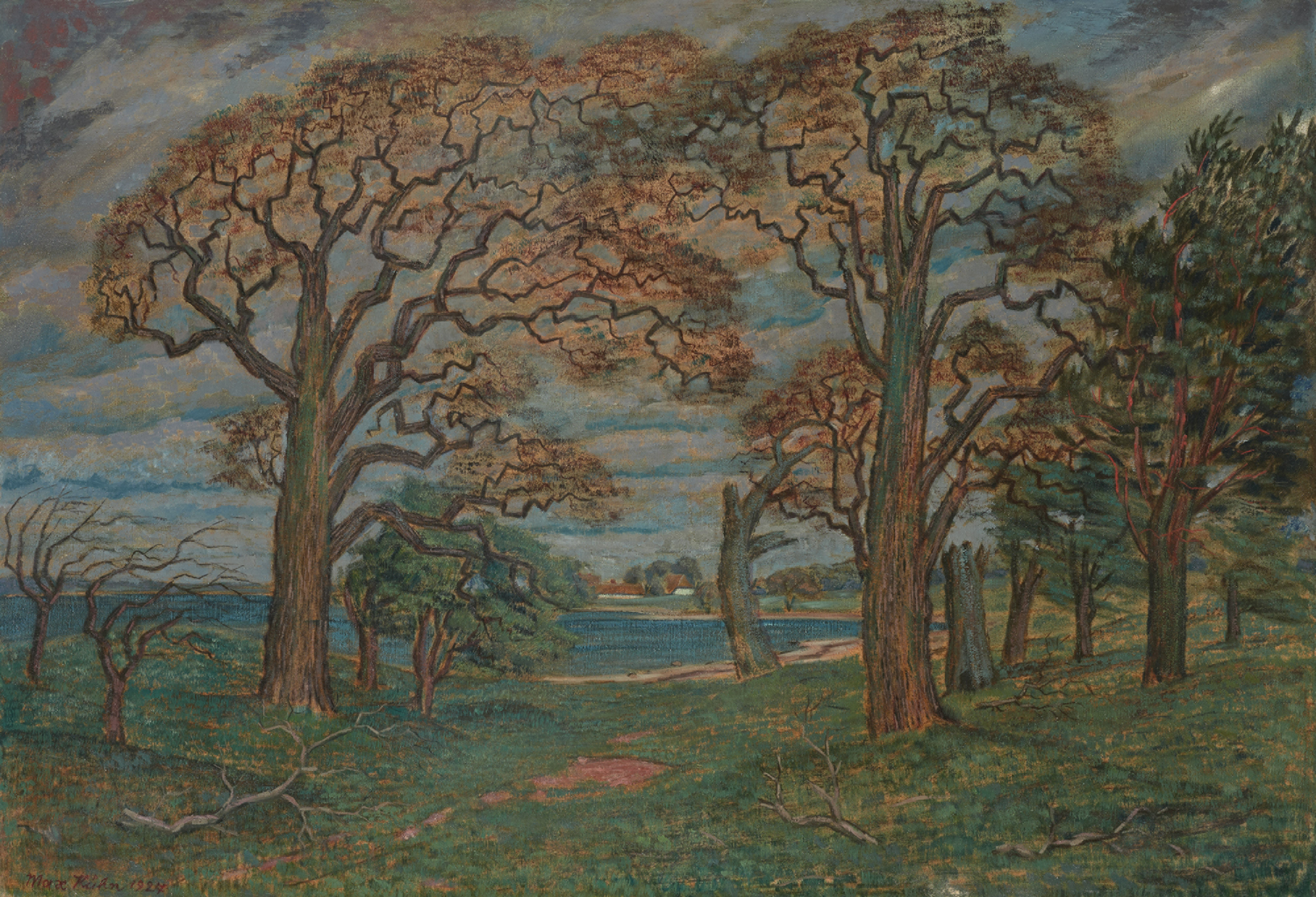 Krajobraz rugijski wprowadził do malarstwa nowoczesnego romantyk Caspar David Friedrich. Syn mydlarza z Greifswaldu, należącego wówczas do korony szwedzkiej, za sprawą studiów w Kopenhadze przyswoił sobie idee „nordyckiego renesansu”. Uwiecznianie ojczystych stron wynikało z pobudek patriotycznych, choć pojawiające się na rysunkach i obrazach elementy wspaniałej dawnej cywilizacji poddawane były zawłaszczającym mocom natury. Powstałe w pierwszej dekadzie XIX wieku widoki z megalitami, inspirowane najsłynniejszym zespołem dolmenów pod Nobbin, wskazywały właśnie na romantyczny kult przyrody jako siły boskiej i wiecznej. Działający sto lat później szczeciński malarz Max Kühn, jak wielu sobie współczesnych, z premedytacją nawiązywał do motywów z œuvre Friedricha, uważanego za klasyka sztuki pomorskiej, ale i niemieckiej, mimo antypruskiego czy antyfederacyjnego wydźwięku późniejszych prac mistrza. Znikły z nich choćby – towarzyszące wizerunkom grobowców megalitycznych – przedstawienia dębów, które po okresie napoleońskim nabrały znaczenia germańskiej trwałości, jedności i siły. Do tej idei nawiązywano znów w czasie dziewiętnastowiecznych wojen pruskich, a zwłaszcza pierwszej wojny światowej, tworząc z dębów „święte gaje” na polowych cmentarzach. Nowe znaczenia nałożyły się na umiłowanie małej ojczyzny Kühna, gdy w maju 1927 roku malował dęby w Vilmnitz na Rugii. Nieopodal tego miejsca znajduje się grobowiec megalityczny, uwieczniony przez artystę rok wcześniej. Przypominający ekspresjonistyczną scenografię kadr z drzewami należy do cyklu „patriotycznych” widoków rugijskich, które stały się własnością otwartego w 1928 roku Prowincjonalnego Muzeum Starożytności Pomorskich (Provinzialmuseum Pommerscher Altertümer).