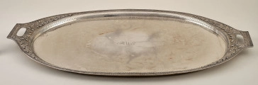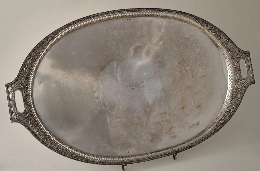 Taca ze zbiorów Potockich, ze srebra, pochodzi z roku 1810. Taca owalna, duża, z podwyższonym ażurowym kołnierzem. Ażur złożony z geometrycznych wzorów, brzeg wywinięty, ozdobiony palmetami i kwiatkami na mat. Lustro tacy gładkie, w centrum wygrawerowany inicjał HWS. Na osi dłuższej tacy dwa owalne uchwyty – otwory w kołnierzu, ozdobione girlandą liści dębu z żołędziami. Na rewersie lustra znaki złotnicze. Tace zdobyły popularność, gdy do użytku codziennego weszły serwisy do herbaty. Na początku XIX wieku, gdy popularne stały się spotkania przyjaciół przy herbacie lub kawie wzrosło zapotrzebowanie na tace, często dość duże, które umożliwiały wniesienie naraz wszystkich potrzebnych akcesoriów (filiżanki ze spodkami, cukiernice, mleczniki itp.), Na większości tac widnieją herby, inskrypcje klejnoty. Z biegiem lat funkcja tac się zmieniała, podawano na nich drobne zakąski, kieliszki czyli wszędzie tam gdzie dwie ręce nie mogły wszystkiego bezpiecznie i elegancko podać.