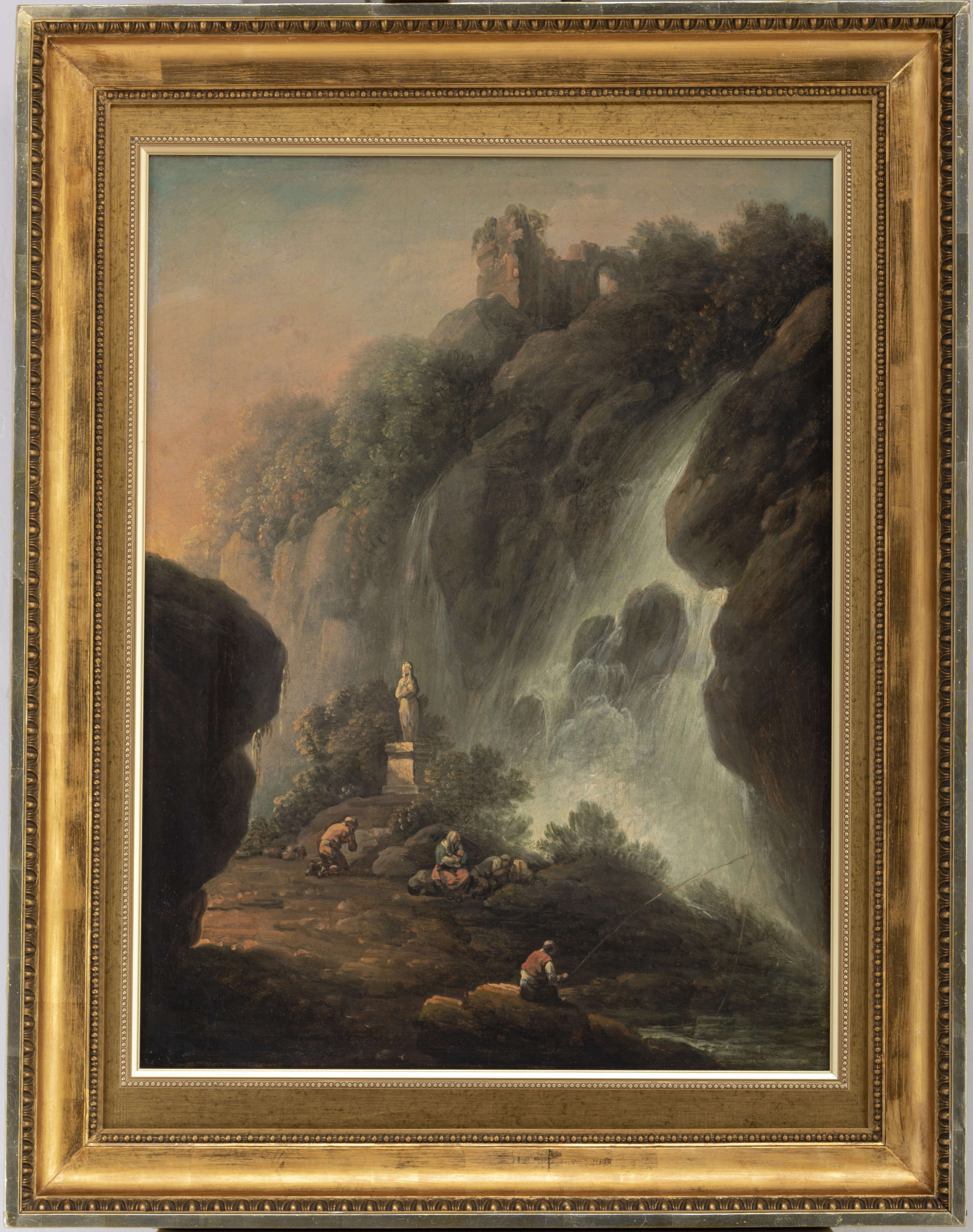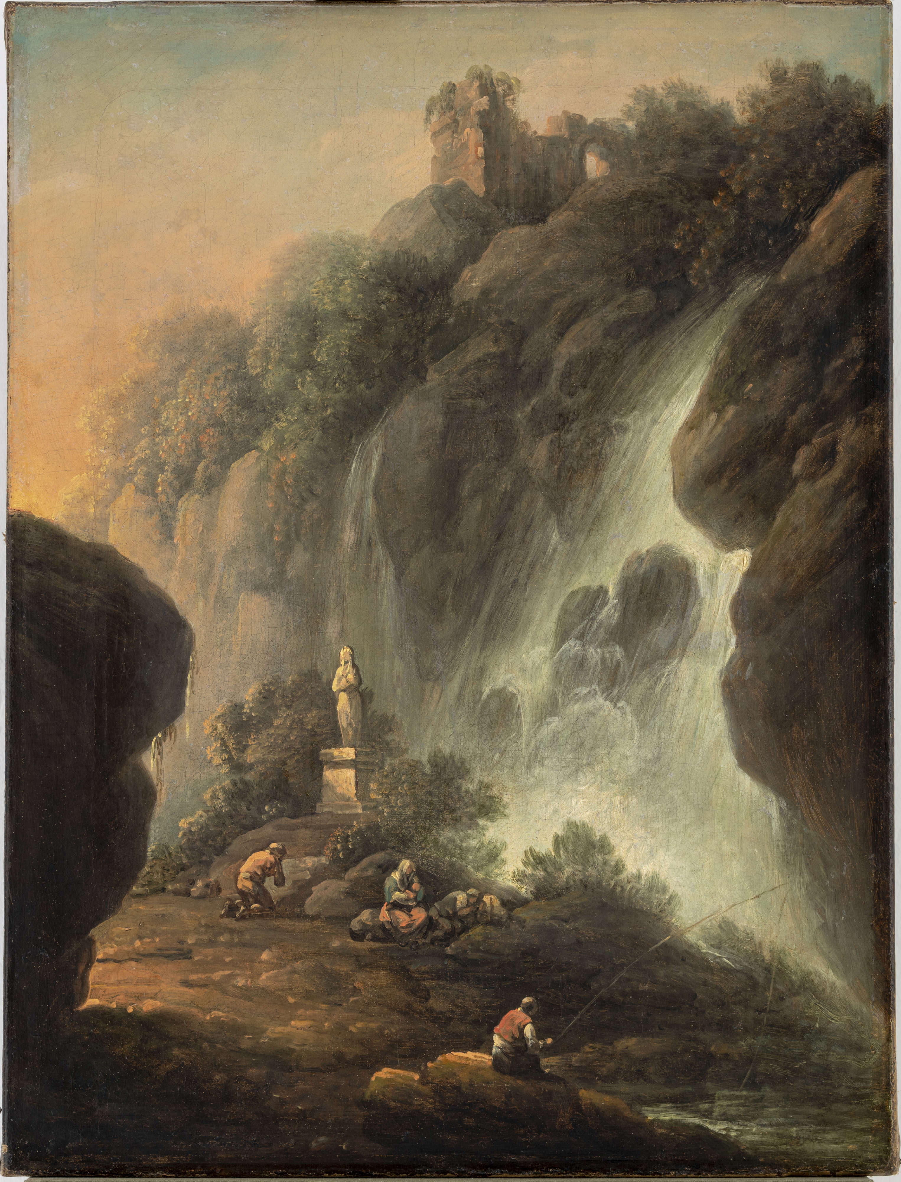 Poetycki, utrzymany w sentymentalno-romantycznej konwencji obraz przedstawia wyimaginowany górski widok ze sztafażem. Pośród potężnych skalistych stoków, z ruinami dawnej okazałej budowli na szczycie, ze spływającym po pionowych urwiskach spienionym wodospadem, widnieje dolina. Kilka osób, ukazanych pod postacią maleńkich figurek, oddaje się różnym zajęciom, które można rozumieć jako metaforę trzech elementów życia ludzkiego: pracy, wypoczynku i modlitwy. Zestawienie miniaturowych postaci z tajemniczą, nieujarzmioną przyrodą podkreśla potęgę i majestat otaczającej ich natury, namalowanej zgodnie z kluczowym dla XVIII-wiecznej estetyki postulatem wzniosłości. Chmurną powagę ukazanego w odległej perspektywie krajobrazu, utrzymanego w spójnej gamie szarości, brązów i zieleni, łagodzi padające z lewej strony subtelne, złocisto-różowe światło słoneczne, przefiltrowane przez delikatną mgiełkę powietrza. Ten istotny element wprowadza do warstwy znaczeniowej kompozycji uzupełnienie, mówi o tym, że przyroda dominuje nad człowiekiem, lecz w sposób przyjazny, bez poczucia grozy. Słońce, które powoli rozświetla łagodnym blaskiem mroczną dolinę, niebawem ogrzeje swoim ciepłem znajdujących się w niej ludzi. W akcie odczytania sensu kryjącego się za widowiskiem sił natury, której elementem jest człowiek, przywołuje skojarzenia sięgające sfery filozoficzno-mistycznej – refleksji nad Stwórcą i jego dziełem stworzenia.
