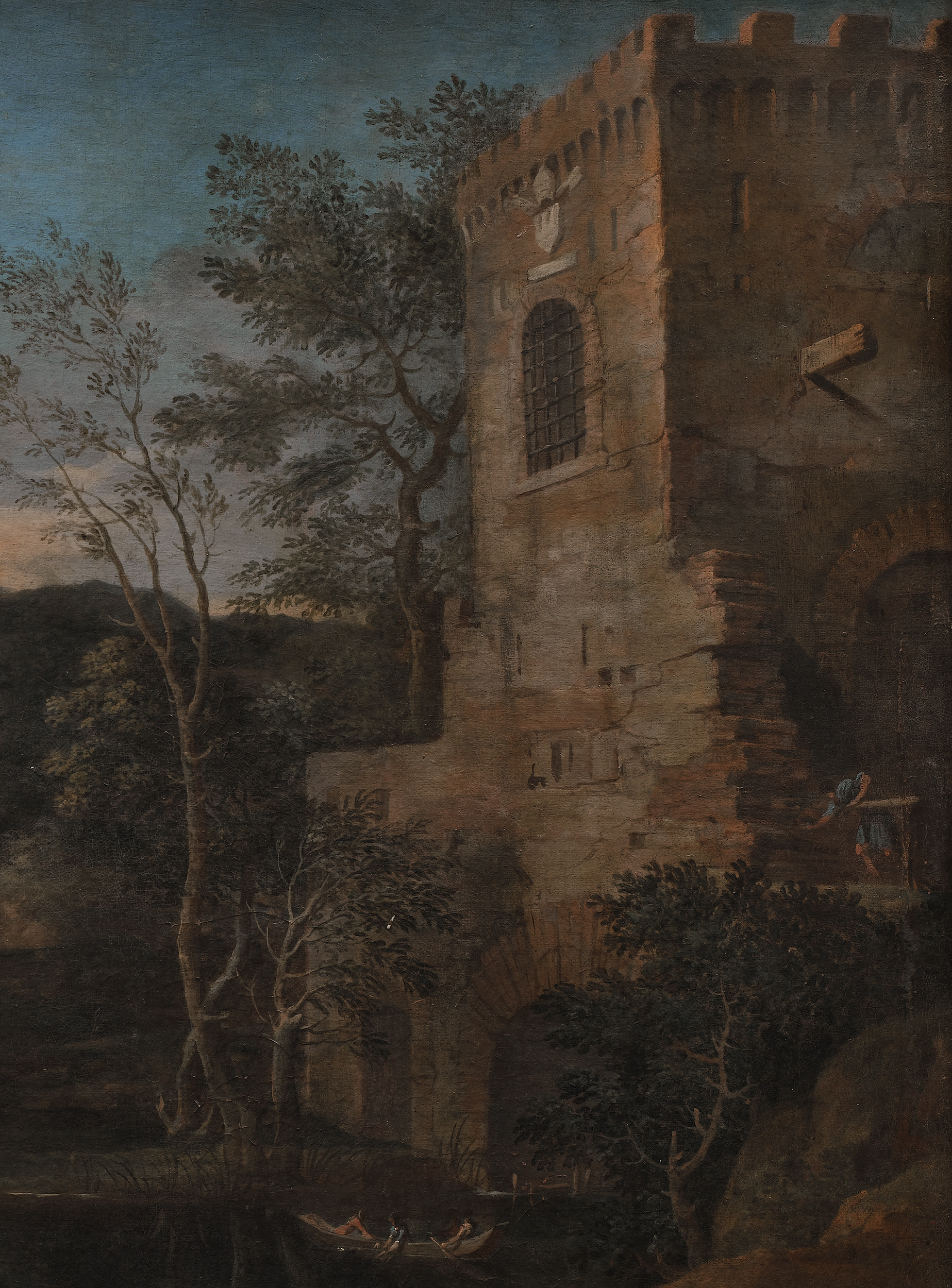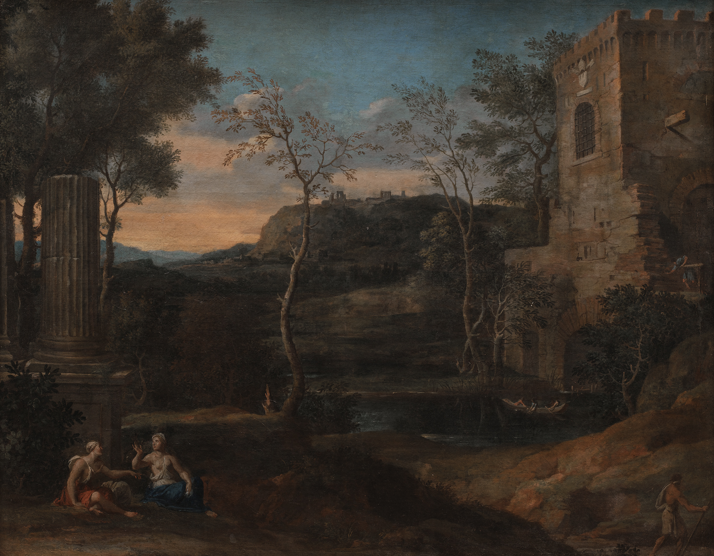 Nad zajmującym centralne miejsce rozlewiskiem wznoszą się ruiny: z lewej na postumencie widoczna baza i część trzonu antycznej kolumny, z prawej na bliskim planie pozostałości średniowiecznej budowli. Kształt obu mógł być podejrzany i naszkicowany we Włoszech uchodzących wśród współczesnych za wzorzec dobrego smaku. Wyrastające tu i ówdzie drzewa dają cień, w którym odpoczywają dwie kobiety. Ich gestykulacja sugeruje ożywioną wymianę myśli. Krajobraz urozmaicony pozostałością kolumnady doryckiej z lewej, przed którą odpoczywają dwie kobiety w strojach antycznych. Z prawej strumień przepływający pod arkadą w wielkiej czworokątnej baszcie. Dalej po bokach wysokie drzewa, tworzące ramę obrazu. W tle, na horyzoncie góry z ruinami . Na pierwszym planie z prawej w wodzie brodzi mężczyzna wsparty na kiju.