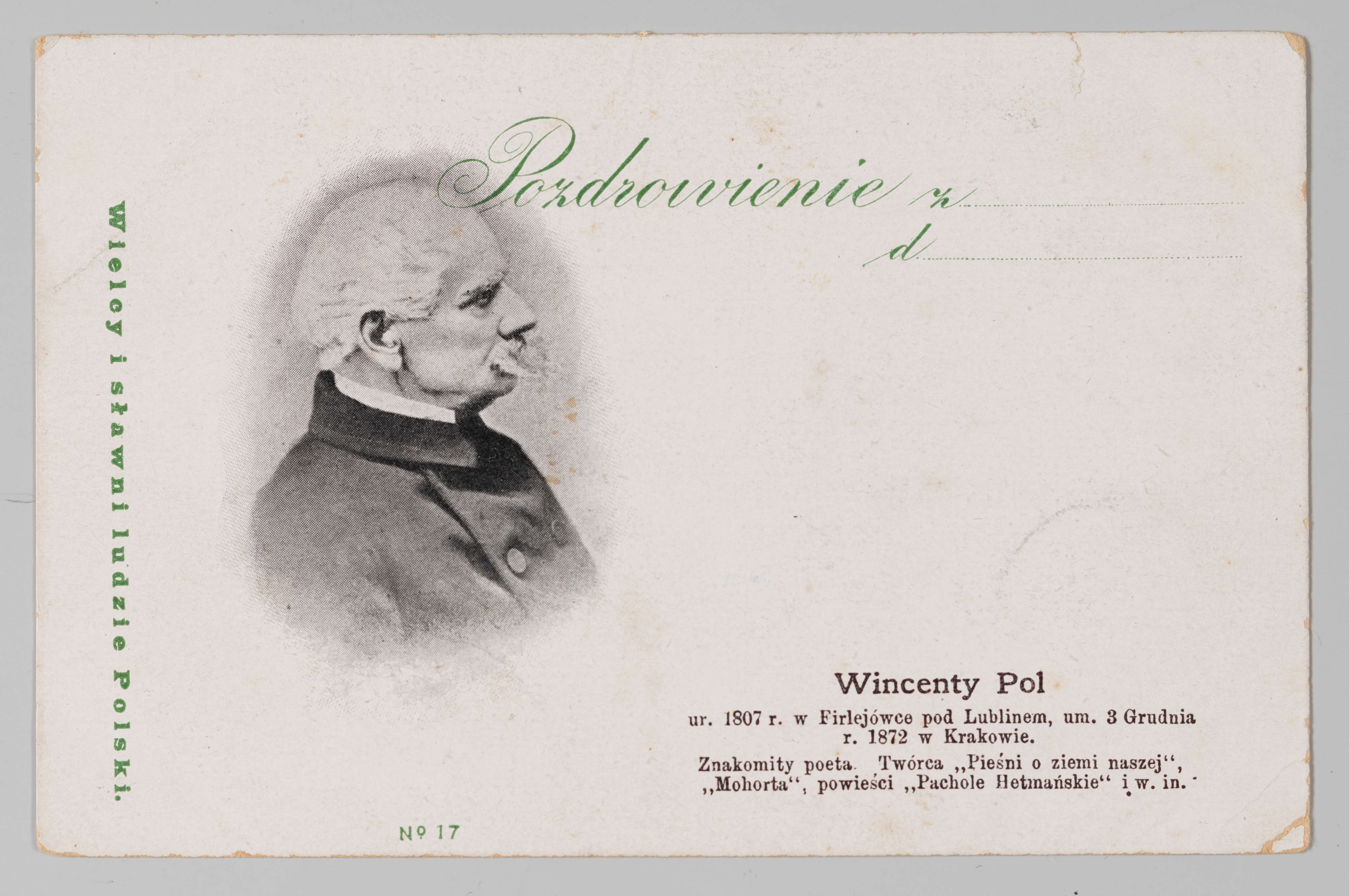 Reprodukcja pocztówki z cyklu "Wielcy i sławni ludzie Polski" z wizerunkiem Wincentego Pola