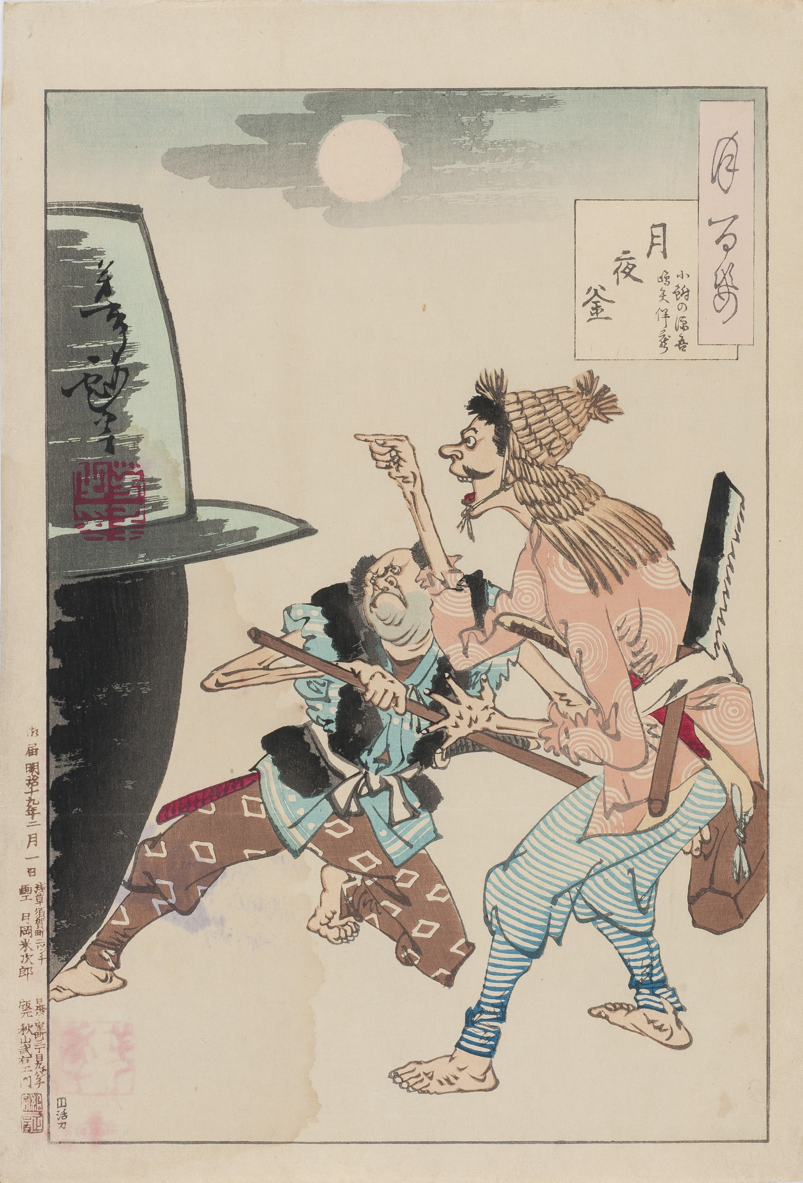 Dwaj łotrzykowie Kofuna no Gengo i Koshi Hanzo, próbują rozbić i ukraść podczas pełni księżyca wielki żelazny kocioł. Kompozycja przypomina "Mangę" Katsushiki Hokusaia (1760-1849). To w rzeczywistości nawiązanie do toba-e, karykaturalnych przedstawień zwierząt i ludzi ze świątyni Kozan nieopodal Kyoto, przypisywanych szlachetnie urodzonemu buddyjskiemu kapłanowi sekty Tendai – Kakuyu (1053-1140) z czasów epoki Heian (794-1185).