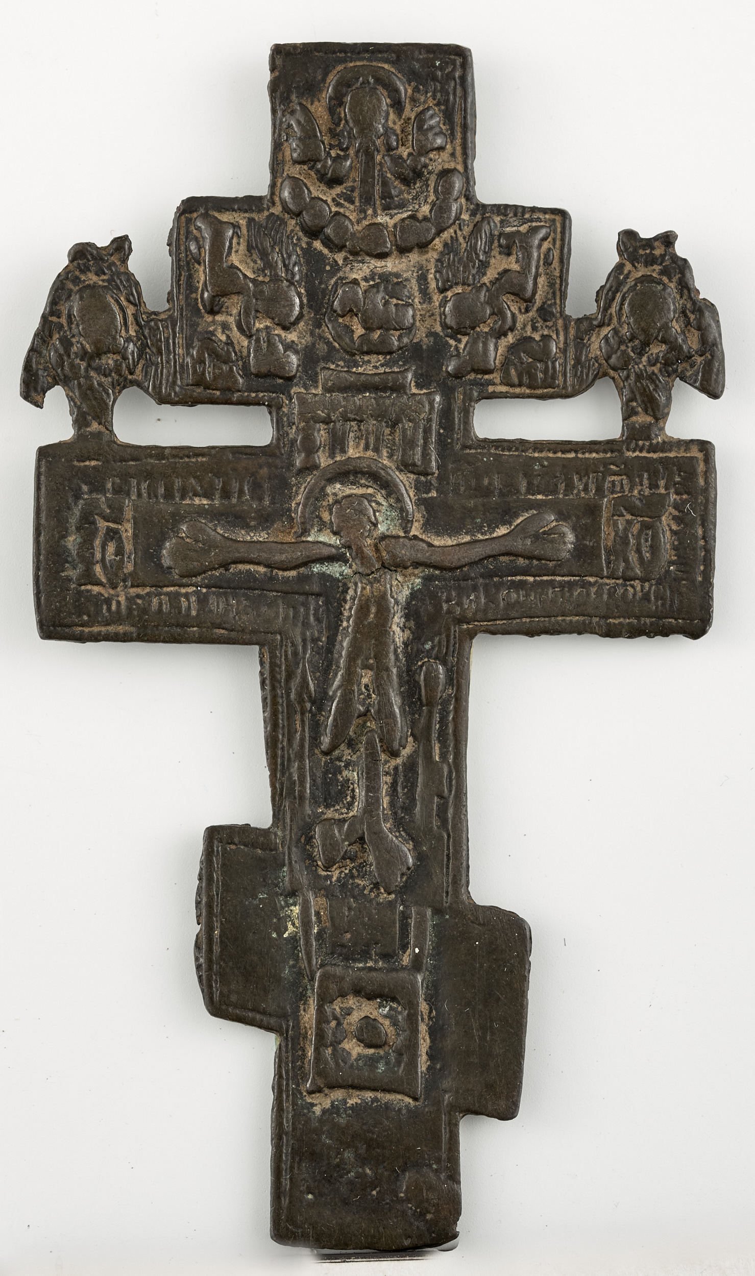 Przywożone z Bizancjum na Ruś metalowe przedmioty kultu chrześcijańskiego zaczęto zastępować od końca XI w. rodzimymi produktami, między innymi ośmiokończastymi krzyżami z trzema poprzecznymi belkami (patrz S.12789MŁ; S.12792MŁ; S.12793MŁ; S.12795MŁ; S.12869MŁ; S.12871-12876MŁ). Ich upowszechnienie bierze początek w niekanonicznych tekstach apokryficznych przyniesionych na Ruś w XII w. Opowieści te dotyczą historii drzewa Krzyża Świętego i choć różnią w się w szczegółach, tłumaczą pochodzenie i kształt krzyża. Na przykład według „Baśni popa Jeremiasza” Set, który był praprzodkiem Jezusa, zasadził przyniesioną z rajskiego ogrodu gałąź na grobie swojego ojca Adama na Golgocie. Według innej wersji zasiał trzy nasiona. Z tej gałęzi czy też nasion wyrosły cedr, sosna i cyprys. Pomijając szczegóły opowieści, z tych trzech drzew wykonano sześciokończasty Krzyż Chrystusa, z dolną belką służącą za podnóżek skazańca, a równocześnie symbolizującą dostojeństwo i majestat. Osmiokończasty krzyż powstał po dodaniu na górze przez Piłata czwartej belki, a właściwie deski z drzewa oliwnego, zwanej z łacińska „titulusem”, a z ruska „tytłem”, na której wypisano winę Chrystusa „Jezus Nazarejczyk Car (Król) Judei” (Mt 27,37; Łk 23,38; Mk 15,26: J 19,19). Chociaż metropolita moskiewski Zozym zaliczył na początku XVI w. apokryfy, jako niezgodne z księgami kanonicznymi, do ksiąg zakazanych, ośmiokończasty krzyż przetrwał. Został on uznany za jedyny dopuszczalny wśród wyznawców starej tradycji cerkiewnej nazywanych staroobrzędowcami. Staroobrzędowcy, zwani także starowiercami, nie przyjęli reformy liturgicznej zapoczątkowanej w prawosławiu moskiewskim przez patriarchę Nikona w połowie XVII w. Pomimo prześladowań od końca XVII w. rozwinęli i zdominowali oni produkcję metalowych przedmiotów kultu religijnego. Z ich wyrobów chętnie korzystali lub naśladowali i kopiowali je wierni oficjalnej cerkwi wyznawcy prawosławia.