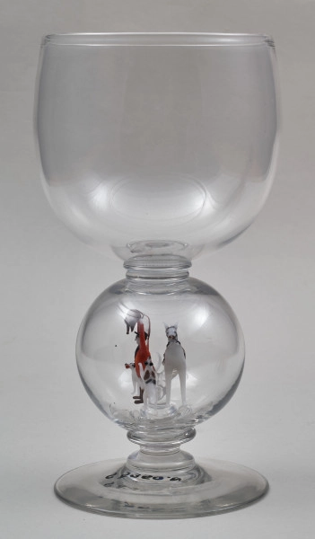 Kielich w typie „Römer” przeznaczony do wina. Posiada półkolistą czaszę z cylindrycznym zwężeniem u góry. Charakterystyczny jest nodus w kształcie kuli. Kielich zakończony jest okrągłą, gładką stopą. Stopa i czara połączone są z nodusem pierścieniami. W nodus wtopiona jest scena myśliwska z tradycyjnego, angielskiego typu polowania par force, wykonana z barwionego szkła. Przedstawiona została stojąca postać myśliwego, unoszącego nad głową w wyciągniętych dłoniach ciało upolowanego lisa. Mężczyzna ubrany jest w brązowe buty z cholewkami, białe spodnie i czerwony żakiet. Obok widoczne są dwie figurki chartów; jeden wspiera się przednimi łapami o swojego pana, drugi spokojnie stoi po drugiej stronie myśliwego. Za postacią człowieka umieszczony jest biały koń z brązową uprzężą i siodłem.