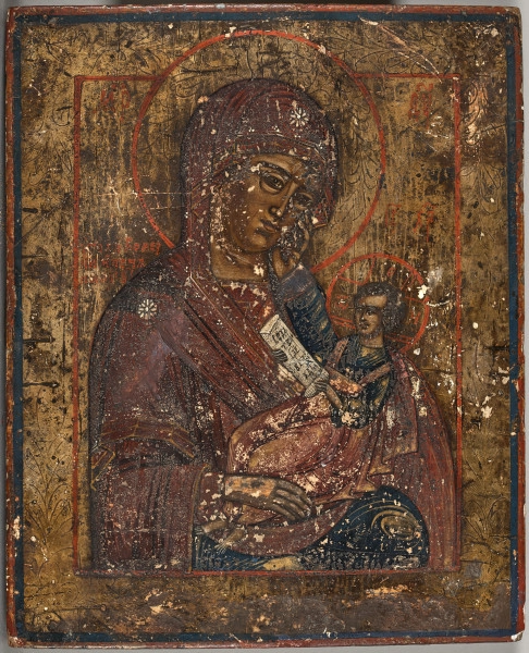 Ikona należy do jednego z wariantów Bogurodzicy Hodigitrii – patrz S.12677MŁ. W rosyjskiej prawosławnej cerkwi prezentowany wizerunek nazywa się Ukojenie Smutku. Bogurodzica podtrzymując prawą ręką na wpół leżącego Chrystusa, lewą dłoń przykłada do twarzy nasłuchując modlitewnych próśb. Według podania pierwowzór ikony znajdował się w Szkłowie obwodu mohylowskiego na Białorusi. Jego kopia została przywieziona w 1640 r. przez kozaków do Moskwy. Ikonę umieszczono w cerkwi św. Mikołaja w podmoskiewskich Pupyszach położonych w Sadownikach za rzeką Moskwą naprzeciwko Kremla. Pod koniec XVII w. w czasie budowy nowej murowanej cerkwi ikona została wraz z wieloma innymi przeniesiona do dzwonnicy i popadła w zapomnienie. Obraz wrócił do kultu w XVIII w. z powodu wydarzenia opisanego w księdze dokumentującej liczne cuda, ale zniszczonej przez pożar w 1771 r. Dokument zaświadczał, że przed ikoną w 1760 r. dokonało się uzdrowienie całkowicie unieruchomionej chorobą kobiety pochodzącej ze znaczącego rodu. Wcześniej chorej objawiła się Bogurodzica nakazując wyjazd do Moskwy do cerkwi na Pupyszach i poleciła modlitwę przez wizerunkiem Ukojenie Smutku. W świątyni jednak nie odnaleziono obrazu z takim napisem. Przeszukawszy wszystkie możliwe miejsca, wydobyto z dzwonnicy zapomnianą ikonę Bogurodzicy. Chora zidentyfikowała ją jako obraz ukazany w widzeniu i pomodliwszy się została całkowicie uzdrowiona. Wydarzenie to miało miejsce 5 lutego (25 stycznia wg kalendarza juliańskiego) i zapoczątkowało przywrócenie kultu, a także ustanowienie na ten dzień święta ikony Bogurodzicy Ukojenie Smutku. W 1771 r. modlitwę przed ikoną uznano za szczególnie skuteczną podczas epidemii cholery. Spopularyzowany wizerunek występuje także w wersji lustrzanej, co opisano pod S.12807MŁ.