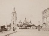 Zdjęcie przedstawia widok placu Sofijskiego od strony Pasażu Włodzimierskiego. Założenie sakralne ukazano z dużej odległości, w taki sposób, aby w całości zmieściło się w kadrze. Na jego tle widoczny jest pomnik Bogdana Chmielnickiego. Po prawej stronie placu znajdują się XIX-wieczne zabudowania, zastąpione późnej przez kamienice pierzei ulicy Włodzimierskiej. Na pierwszym planie po prawej stronie widok flankuje gmach Peczerskiego Sądu Rejonowego miasta Kijowa. Po lewej stronie Pasażu Włodzimierskiego uchwycona została dorożka. Zdjęcie zostało tak skadrowane, że żaden z elementów nie dominuje nad pozostałymi. Wysoką fasadę sądu równoważy monumentalna dzwonnica. To sam plac jest tematem fotografii, nie konkretny obiekt.