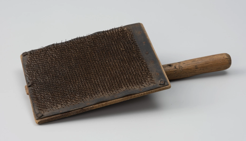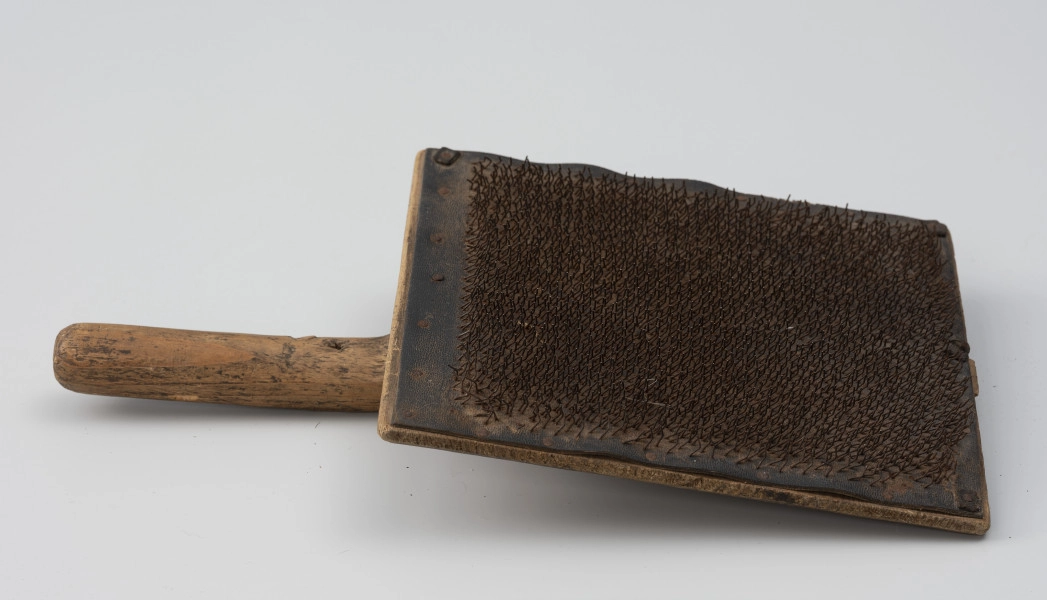 Prezentowana szczotka gręplarska ma typowy, prostokątny kształt. Pochodzi z terenu Pomorza Zachodniego, z drugiej połowy XIX w. Do zbiorów muzealnych trafiła, jako dar od osoby prywatnej w latach 70. XX wieku.