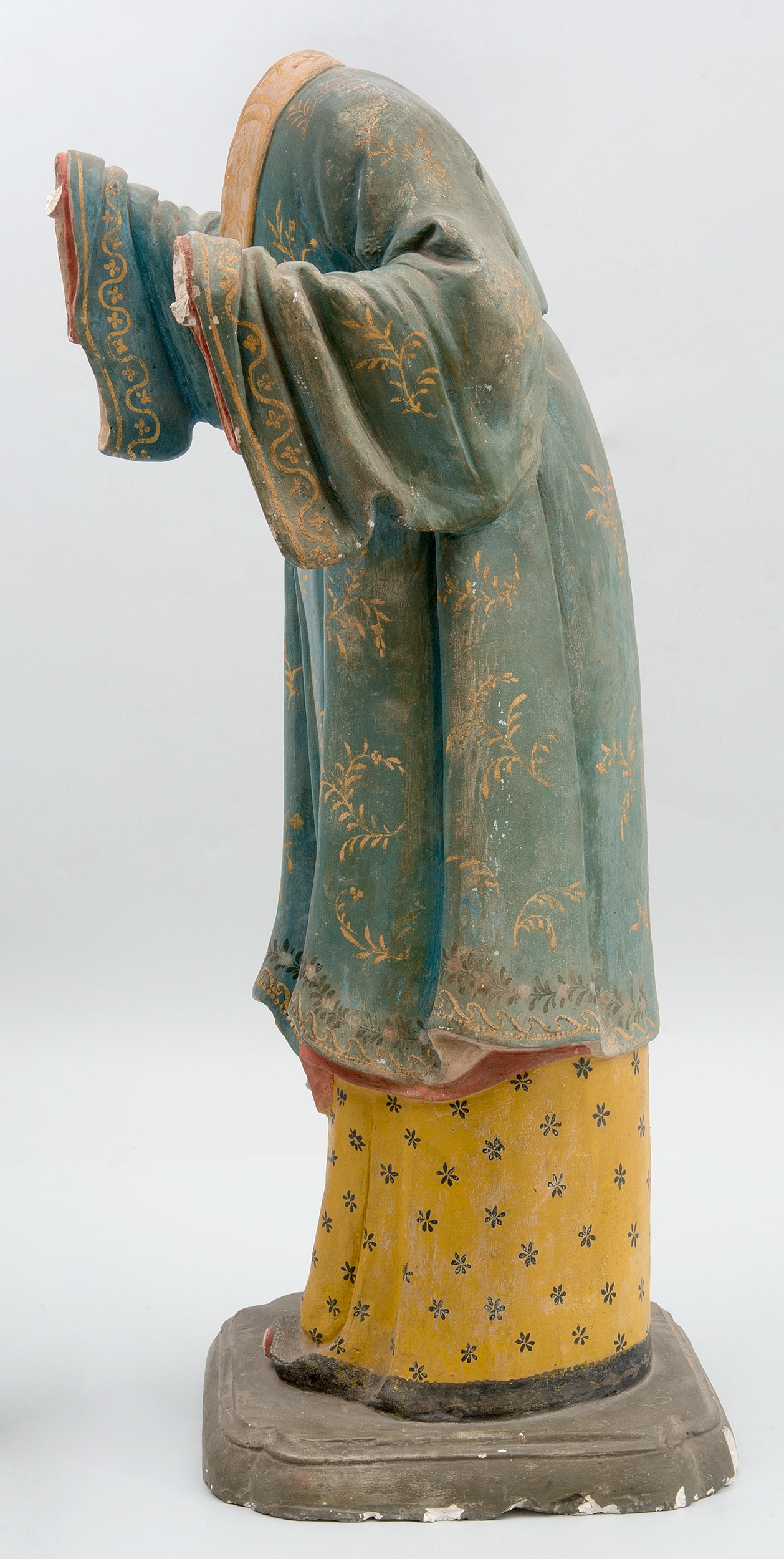 Polichromowana figurka na podstawie wykonana z gliny suszonej. Przedstawia łysego, zgarbionego mężczyznę w stosunkowo dynamicznej pozie z lewą nogą wysuniętą do przodu i uniesionymi rękoma. Mężczyzna ma zamyślony, skupiony wyraz twarzy, o fizjonomii wskazującej, że jest on w dojrzałym wieku. Postać ubrana jest w lejące, pięknie udrapowane szaty. Wierzchnia szata w turkusowym kolorze ozdobiona jest różową bordiurą stanowiącą wykończenie dekoltu, zaś rękawy i dolna część szaty została ozdobiona ornamentalnym pasem. Spodnią warstwę stroju w kolorze żółtym zdobią drobne motywy kwiatowe, a dół zamyka ciemniejszy pas bordiury ze złoceniem.