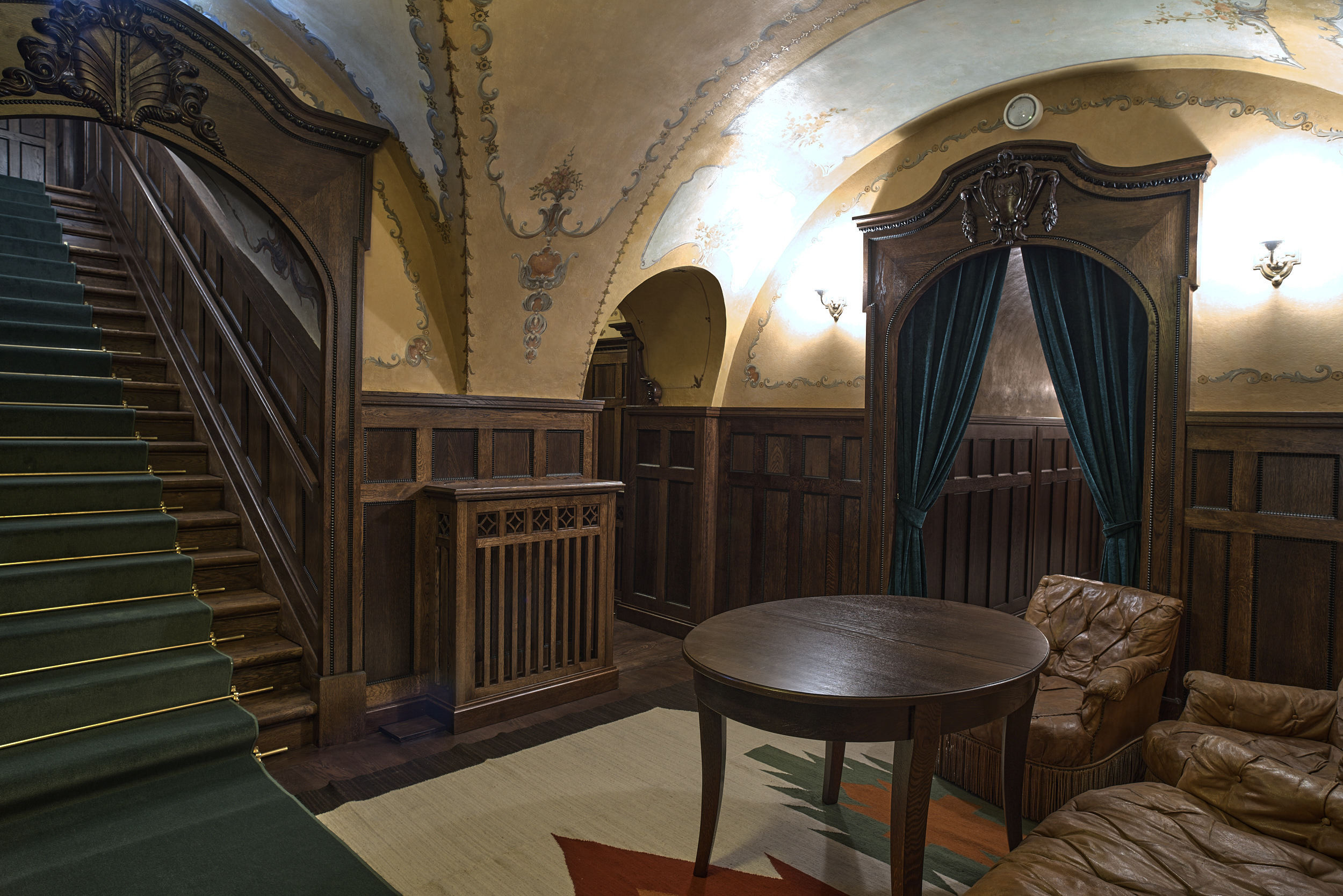 Poczekalnia do której prowadzą schody jest wnętrzem na planie prostokąta ze sklepieniem krzyżowym, z wysoką, drewnianą płycinową boazerią oraz trzema drewnianymi portalami ujmującymi otwór klatki schodowej i wejścia do dwóch korytarzy w ścianie wschodniej i południowej. W zwieńczeniu portali w ścianie wschodniej i zachodniej z pseudopalmetą, w zwieńczeniu portalu w ścianie południowej z kartuszem i datą 1928. Na ścianie północnej wieszak w formie płyciny boazeryjnej z listwą z wieszakami zwieńczonej tympanonem, po bokach której dwa prostokątne lustra w płaskich drewnianych ramach. Ściany i sklepienie mają dekorację malarską przede wszystkim z motywami kwiatów, rocailli, kampanul i kwiatonów. Podłoga drewniana.
