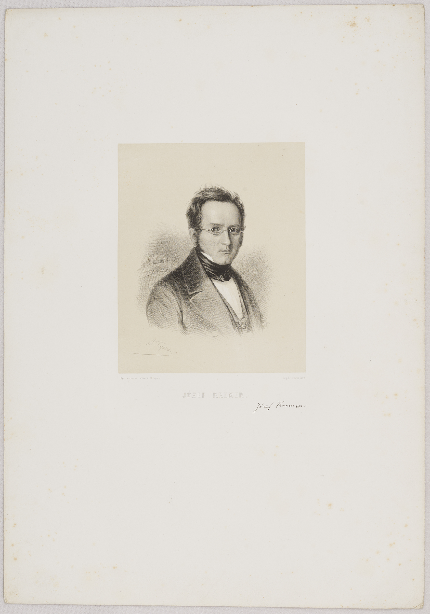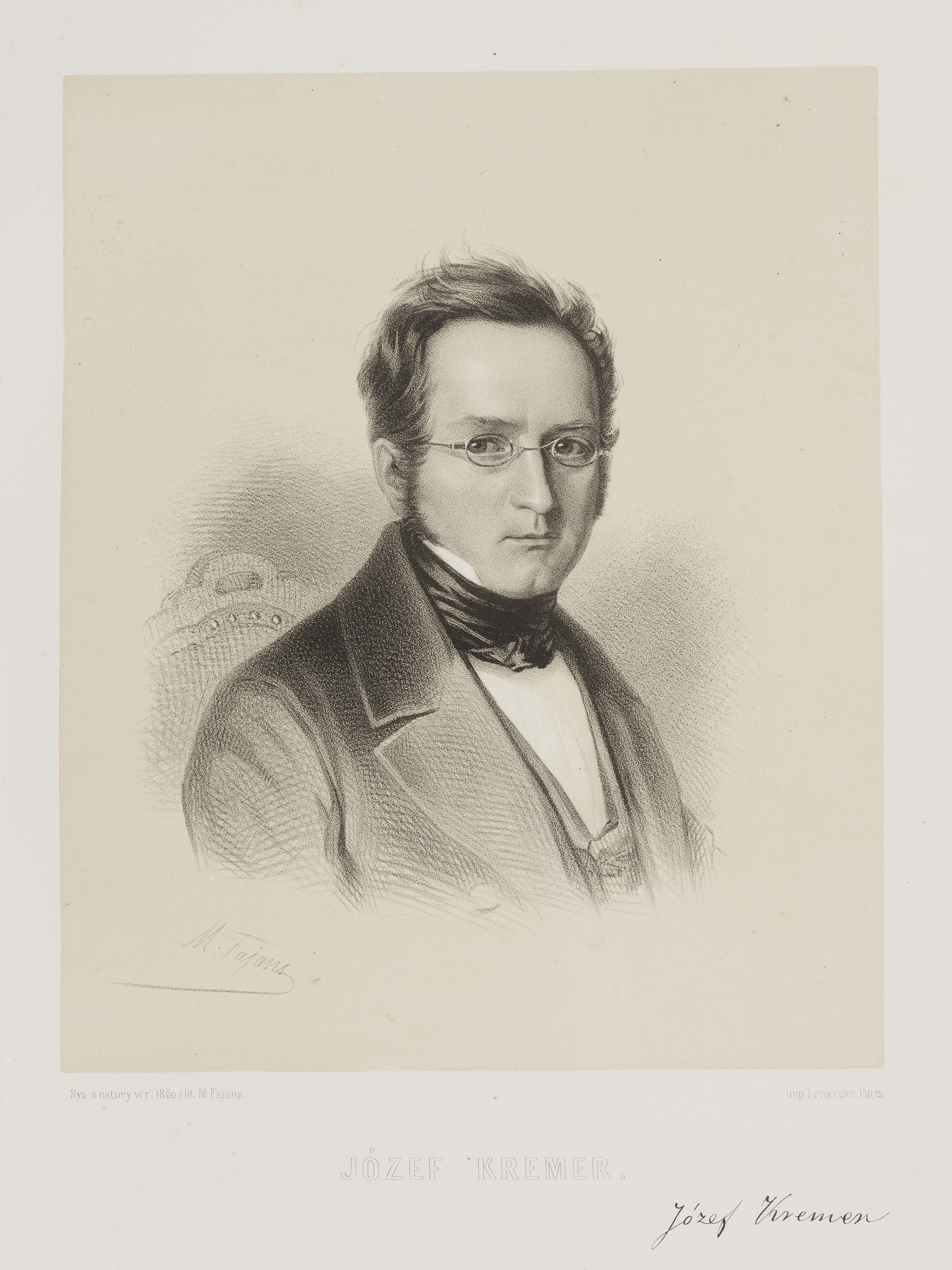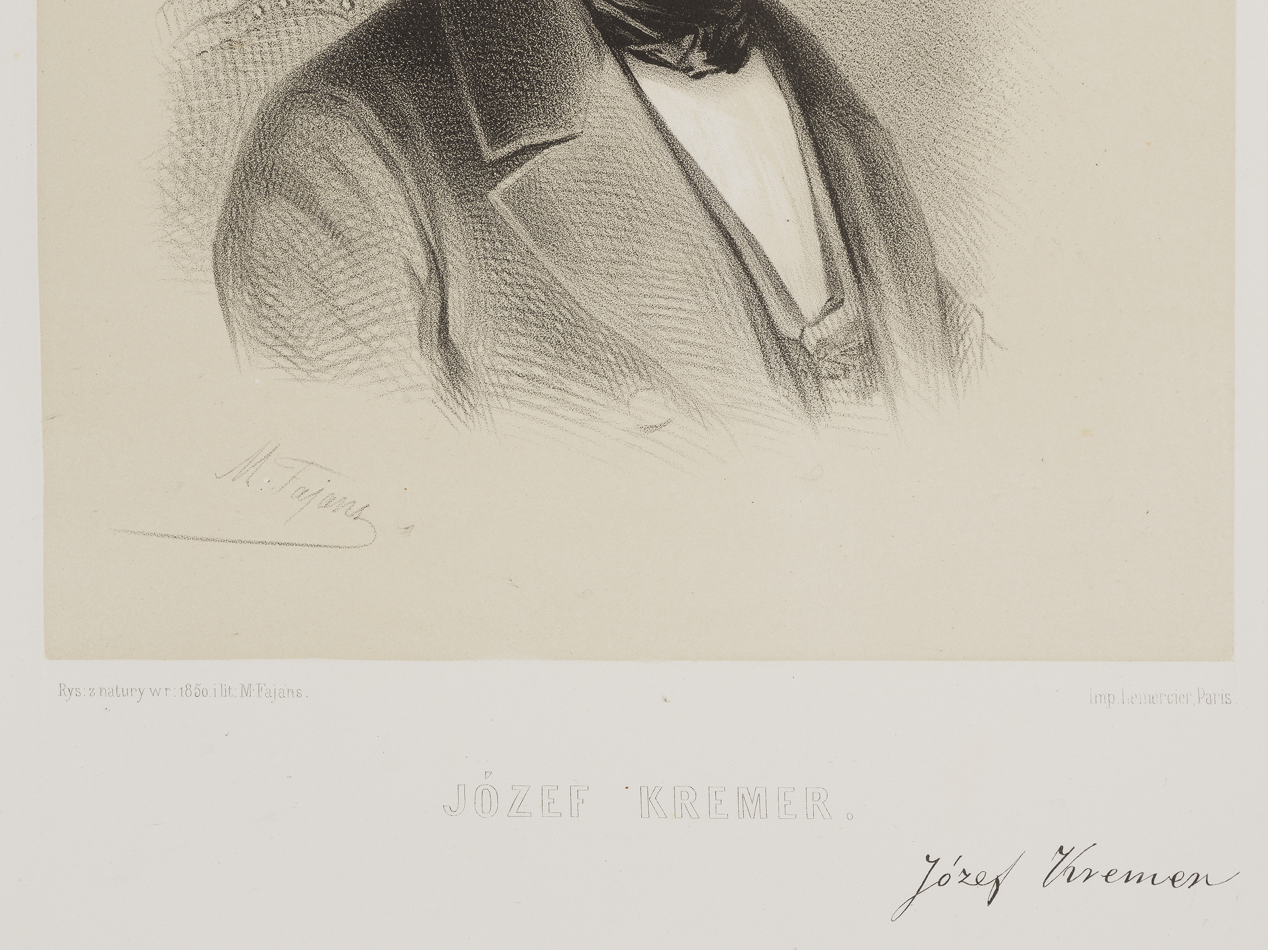 Jest to wizerunek wykonany w technice litografii, który należy do zbioru zatytułowanego „Wizerunki Polskie”, a ukazującego się w latach 1851-1862. Pomysłodawcą, autorem i w znacznym stopniu jego wykonawcą był Maksymilian Fajans (1827-1890), artysta związany z Warszawą, prowadzący tu przez wiele lat zakład litograficzny oraz fotograficzny. Cykl, do którego należy portret Józefa Kremera powstał jako odpowiedź na ówczesną sytuację Polaków pozbawionych własnego państwa i żyjących pod trzema zaborami. Naturalną potrzebą stało się zainteresowanie wspólną przeszłością, ale także postaciami, które „zasługą lub talentem przyczyniły się do chwały narodu”. (I. Tessaro-Kosimowa, Historia litografii warszawskiej, Warszawa 1973). Józef Kremer był krakowskim profesorem, badaczem historii oraz historii sztuki, autorem, m.in., monumentalnej, liczącej pięć tomów „Podróży do Włoch”, w której dał szeroką panoramę historii, kultury oraz sztuki półwyspu apenińskiego. W „Podróży…” zawarł nie tylko samą relację z drogi oraz spotykanych miejsc, gmachów historycznych czy dzieł sztuki, ale też ukazał krajobraz Włoch przez pryzmat głębokiego osobistego przeżycia, estetycznego i duchowego, opierając się przede wszystkim na wartościach wyznaczanych przez chrześcijaństwo. W litografii ze zbioru Fajansa zwraca uwagę niezwykła dbałość wykonania podobizny, rysunek, który jest najbardziej precyzyjny w obrębie twarzy portretowanego, przy pozostałej części (popiersiu) przechodzącej w co raz mocniej szkicowy charakter. Maksymilian Fajans wykonał portret rysunek do litografii z natury, o czym informuje nas podpis odbity z płyty. Poza nim, znalazł się tu również podpis identyfikujący portretowaną postać oraz faksymile jej odręcznego podpisu, podnosząc poznawczą wartość odbitki. Litografia jest dwukolorowa (biało-czarna), a jej druk wykonano w słynnym paryskim warsztacie należącym do Rosé-Josepha Lemerciera, u którego Maksymilian Fajans odbywał praktykę.