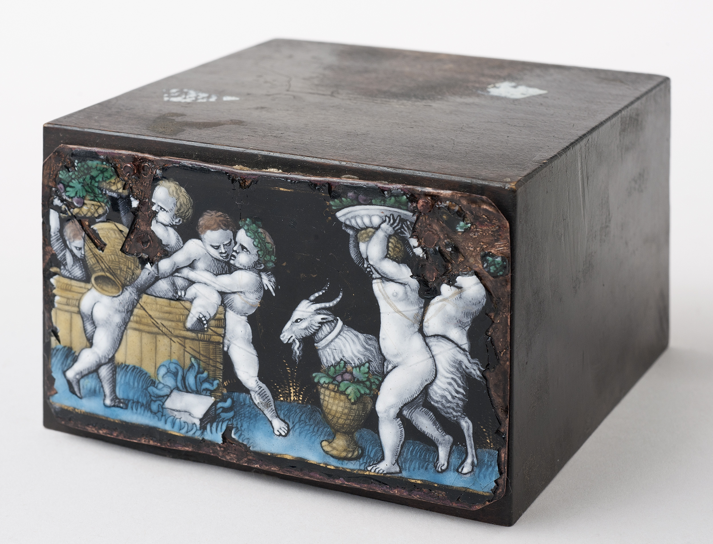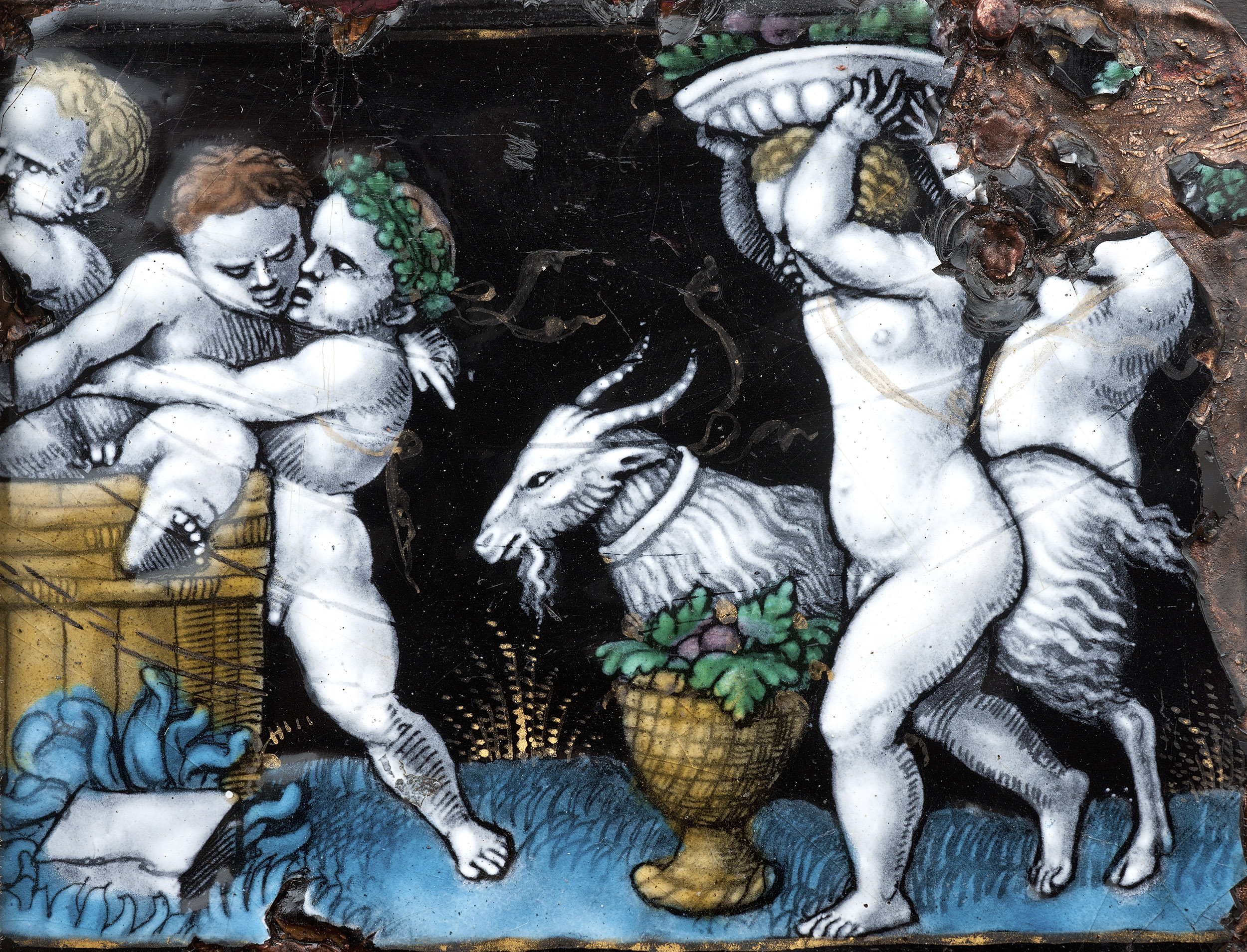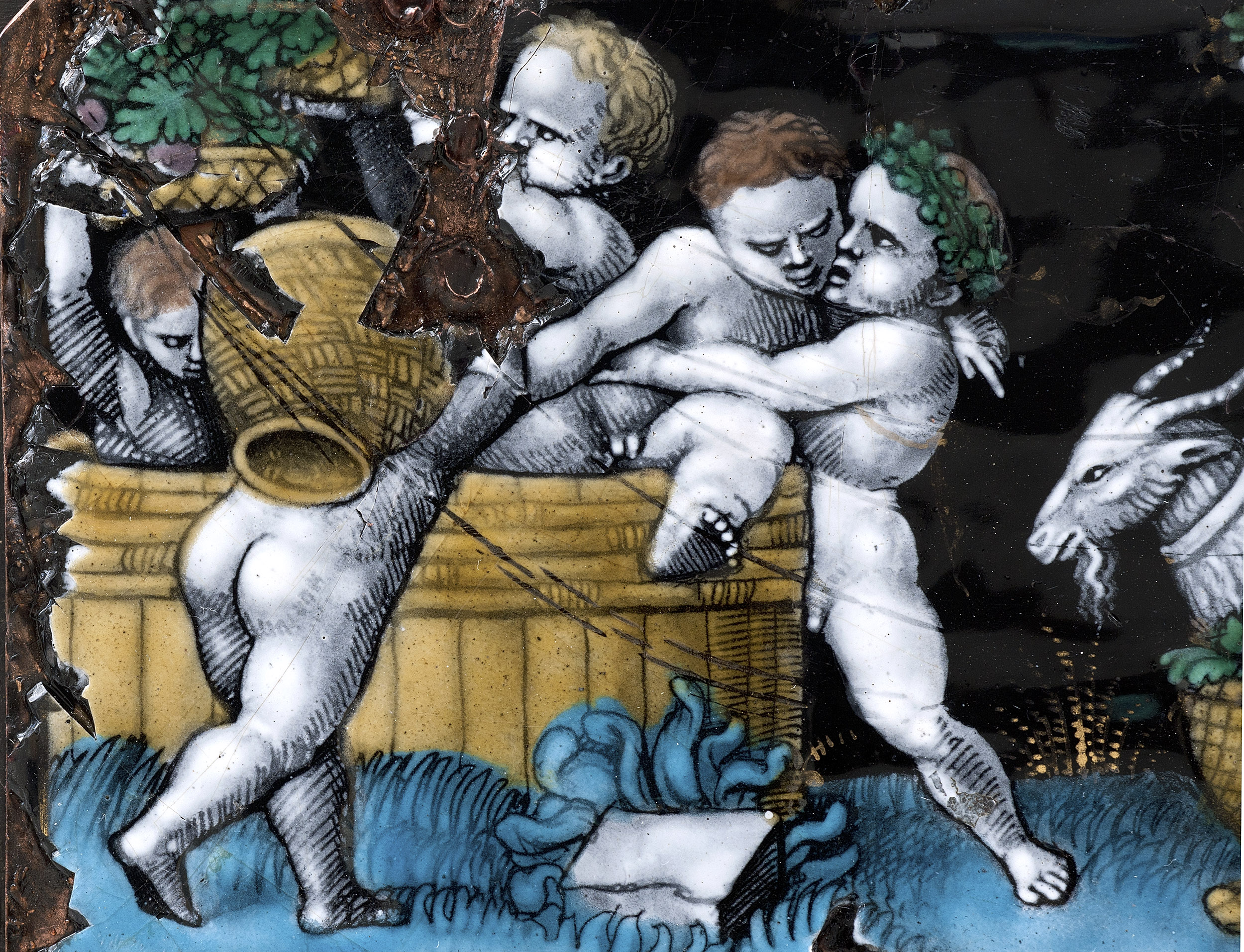 Prostokątna plakieta przedstawia scenę rodzajową z puttami zajętymi winobraniem i ubijaniem winogron w kadzi. Dwójka chłopców po prawej stronie zbliża się, niosąc nad głową misy ze ściętymi kiściami owoców. Puttom towarzyszy rogaty kozioł z przewiązką na szyi. Obok niego na ziemi stoi wypełniony wiklinowy kosz, przykryty liśćmi. Widoczna wokół kadzi piątka pozostałych kupidynów jest zajęta uzupełnianiem zasobu oraz ubijaniem zgromadzonych gron. Jedno putto właśnie wychodzi z beczki przy pomocy mocarnego przyjaciela w zielonym wieńcu laurowym na głowie, inne zbliża się, aby wyrzucić owoce z kosza targanego na plecach. Przed zbiornikiem leży na ziemi prostopadłościenny kamień ułatwiający wejście i wyjście.