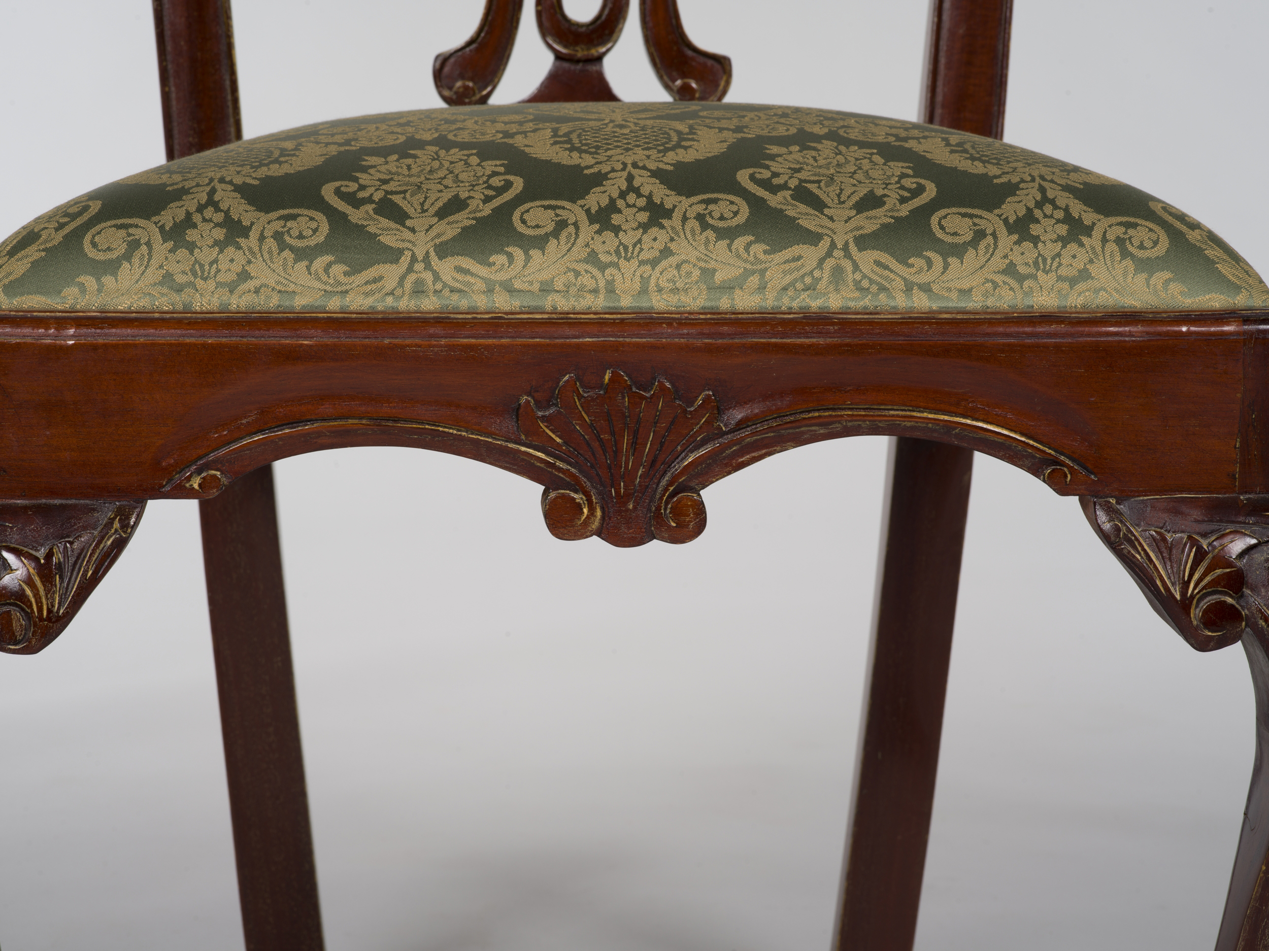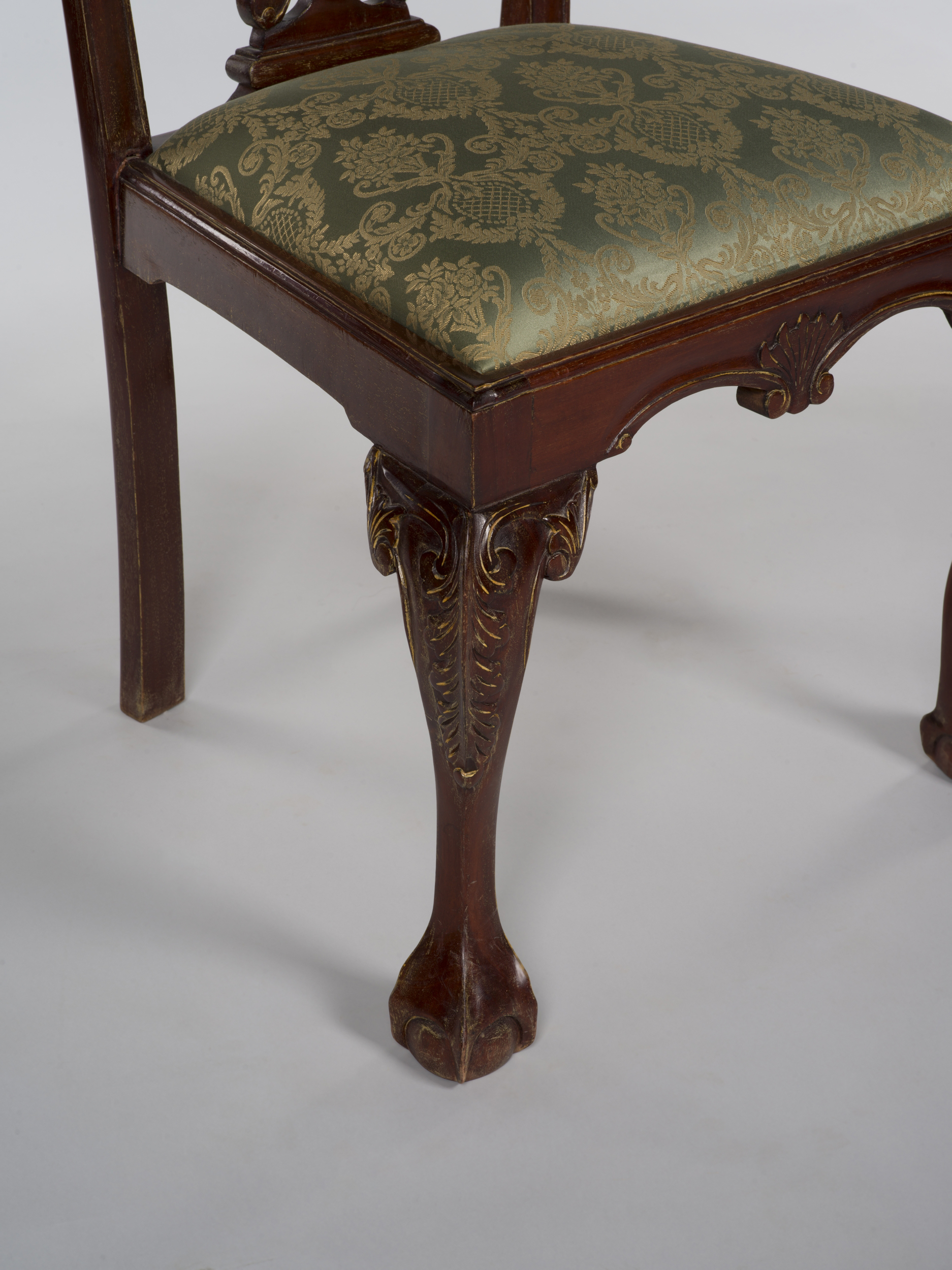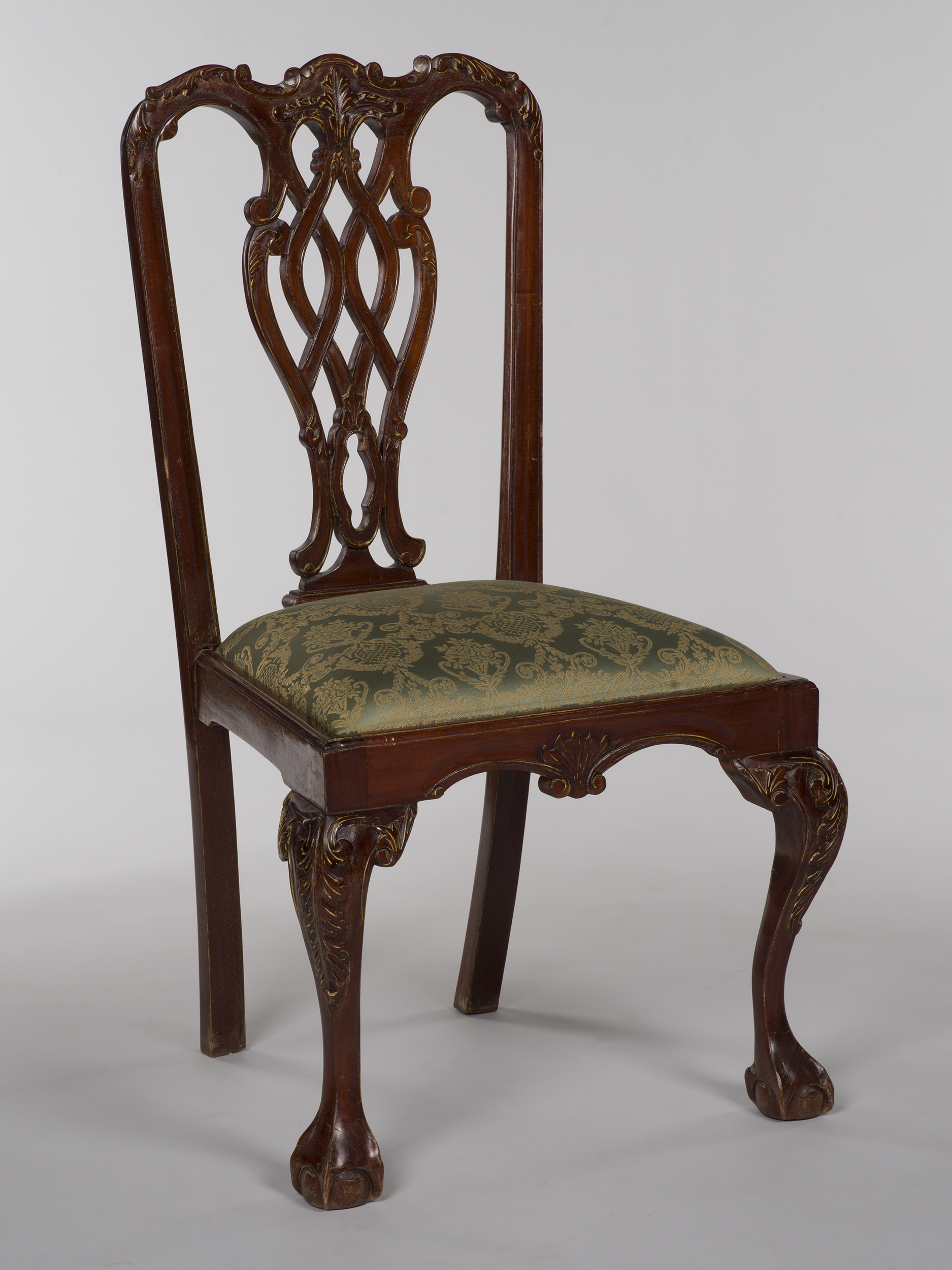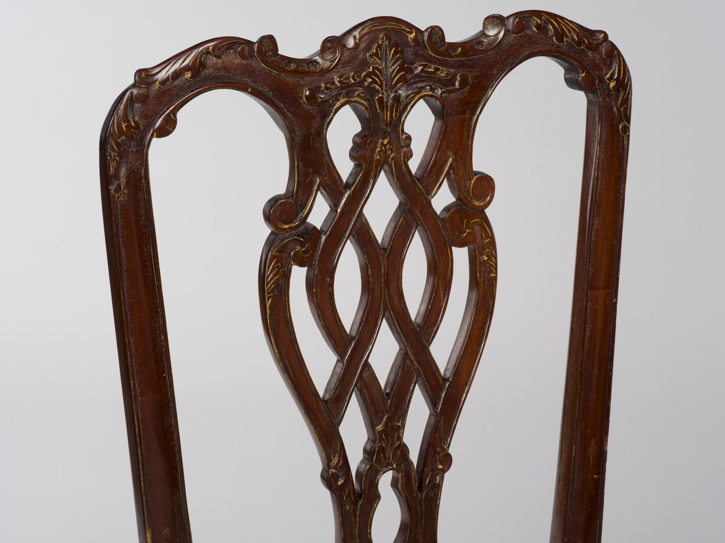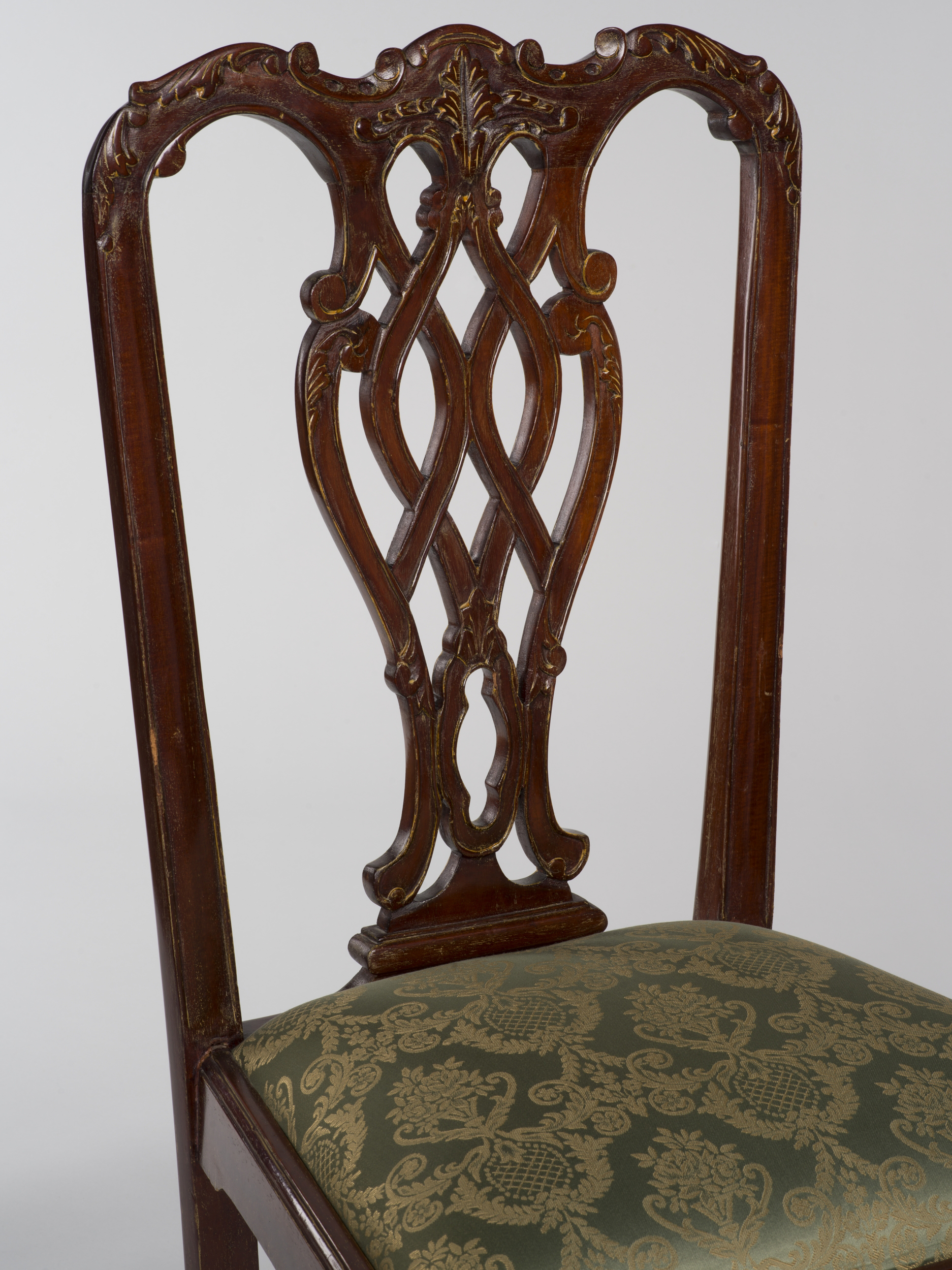 Stanowi element kompletu mebli jadalnianych w stylu chippendale, złożonego ze stołu, sześciu krzeseł i dwóch foteli.