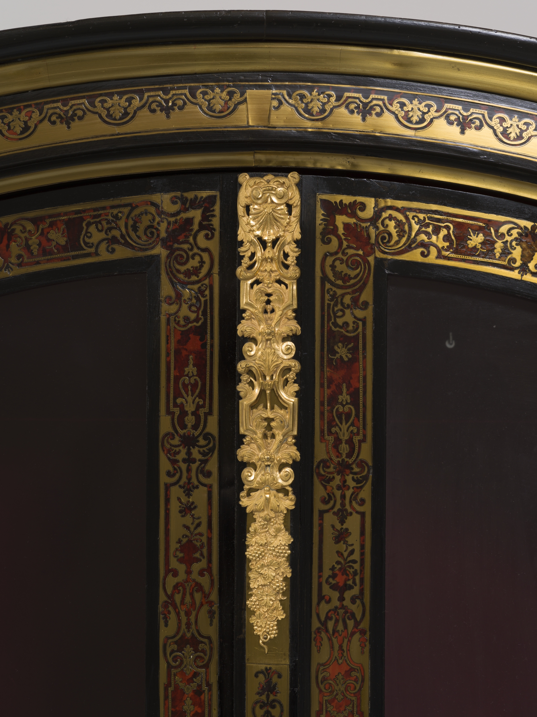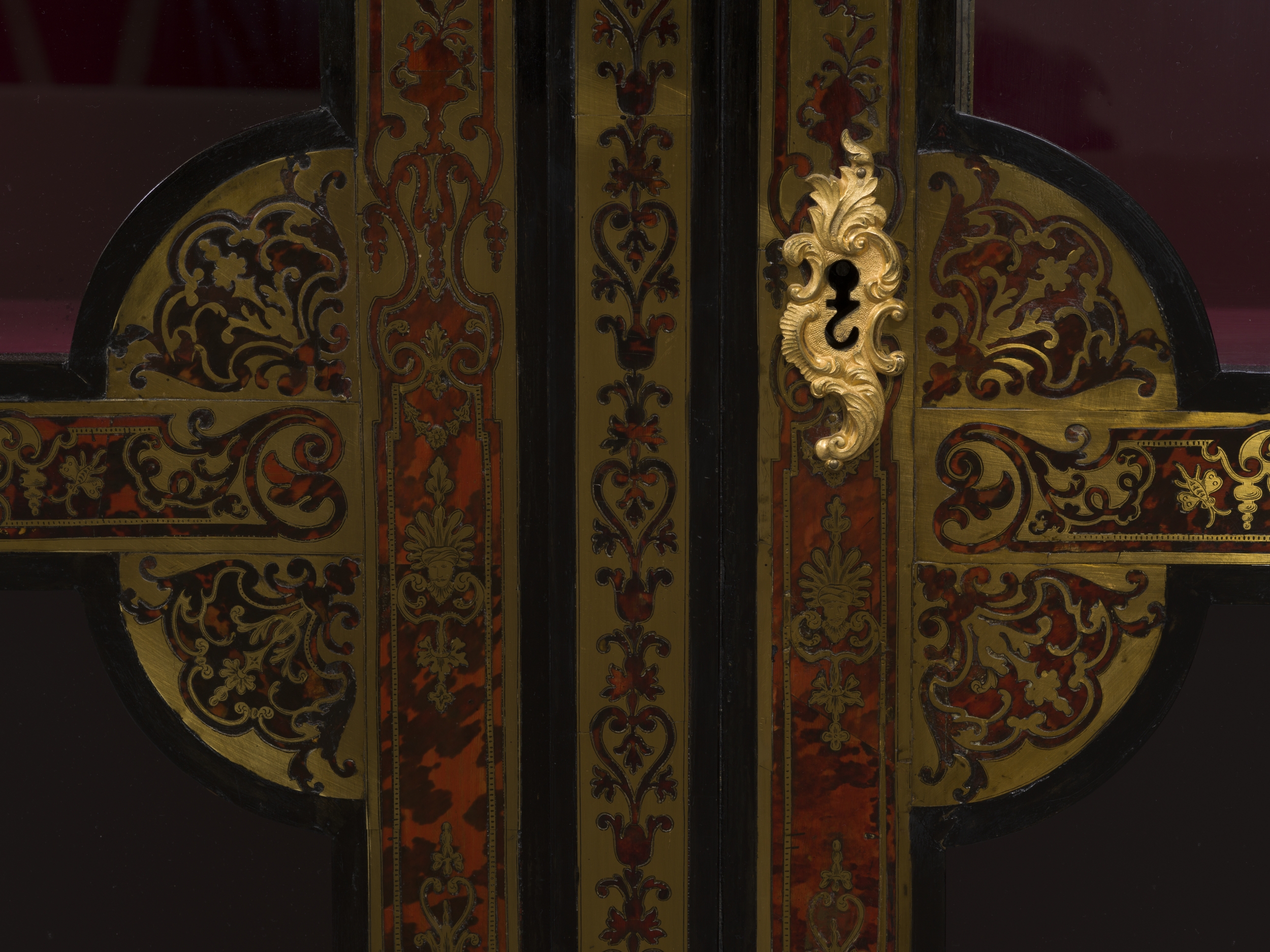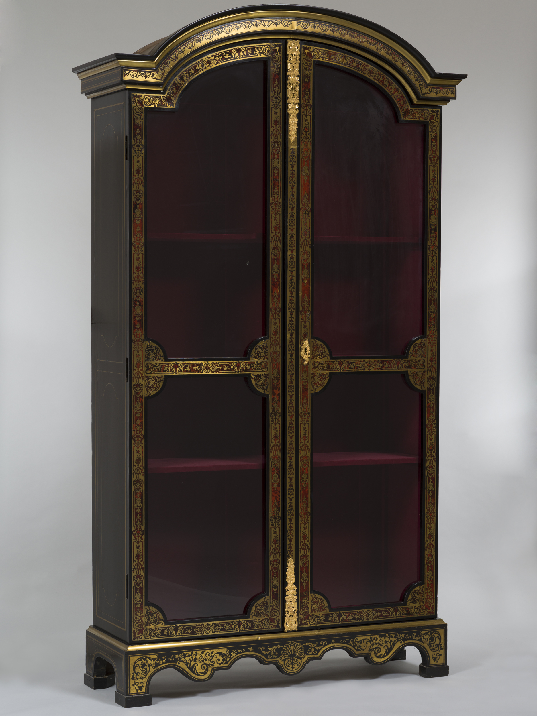 Jedna z pary (Wil.3093, Wil.3094) szczególnie cennych bibliotecznych szaf witrynowych z epoki Ludwika XIV przypisanych ebeniście paryskiemu Nicolas Sageot. Obok najwyższej klasy mistrza markieterii André-Charlesa Boulle’a dzieła Sageot cieszyły się najwyższym uznaniem dworskiej klienteli. Prostopadłościenna forma mebla z wystającym gzymsem wieńczącym w kształcie łuku, ustawiona na niskim cokole przechodzącym w cztery nogi zachwyca prostotą i proporcjami. Dwuskrzydłowe drzwi są w całości przeszklone czterema taflami przedzielonymi listewkami. Główny walor mebla stanowi inkrustowana dekoracja w zestawieniu czerni hebanu, brunatnej czerwieni szylkretu i złoconego mosiądzu pokrywająca powierzchnie fasadowe. Ramy dwuskrzydłowych witrynowych drzwi zdobi bordiura rytmicznie powtarzającej się sekwencji motywów arabeskowych misternie wyciętych z mosiężnej blachy i szylkretu, inspirowanych wzorcami Jeana Béraina (1640-1711). Technologia markieterii polegająca na równoczesnym wycinaniu rysunku ornametu ze złożonych warstwowo arkuszy, w tym wypadku szylkretu i mosiądzu, pozwala na pełne wykorzystanie użytego materiału przy wyrobie pary bliźniaczych szaf, w których w jednej z nich tłem jest brunatno-czerwony szylkret ze złotym ornamentem (premier partie), w drugiej złocony metal jest tłem dla brunatno-czerwony szylkretowego ornamentu (contre partie).