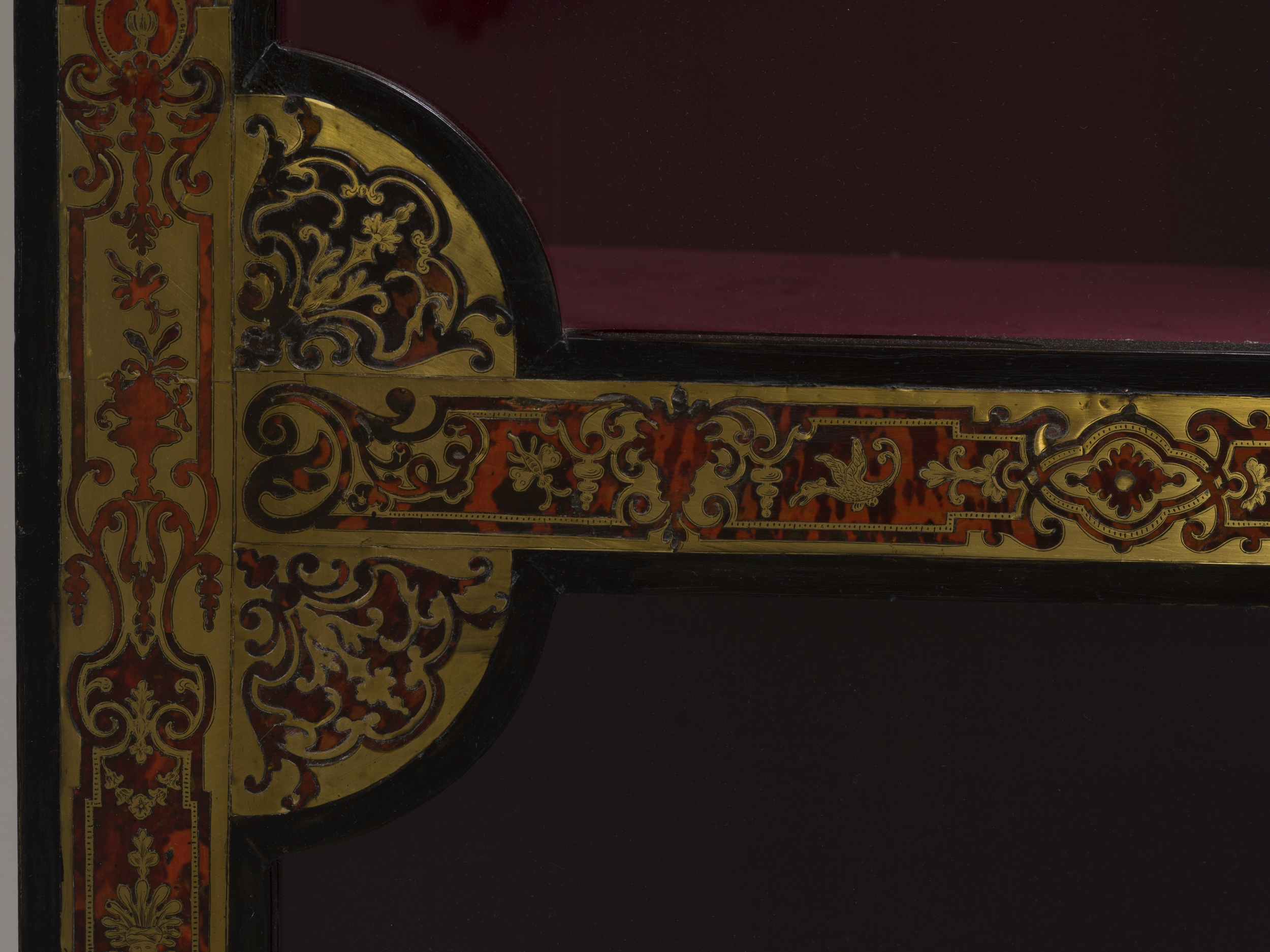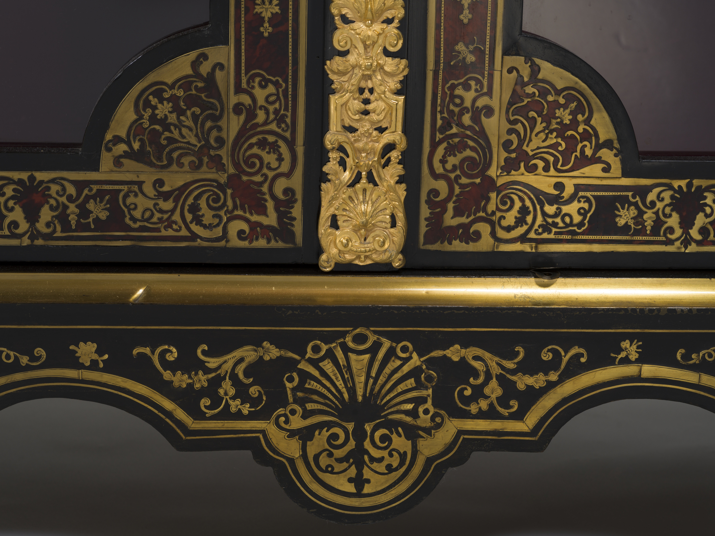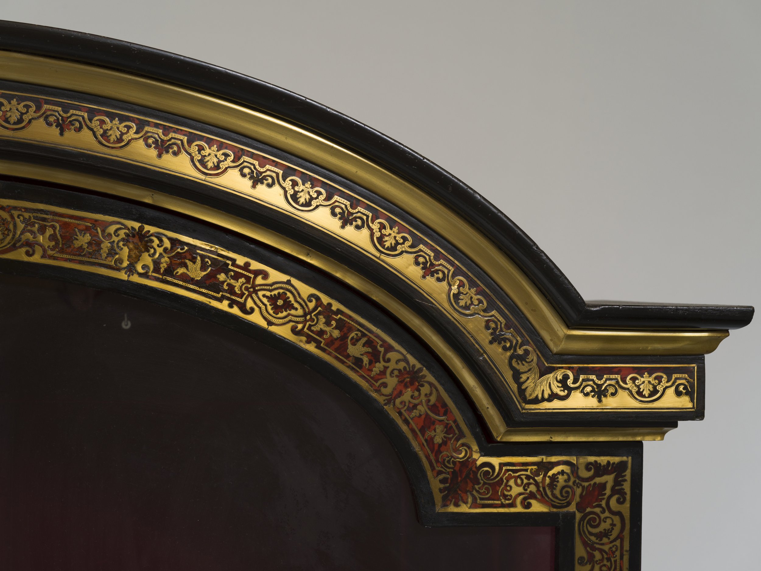 Jedna z pary (Wil.3093, Wil.3094) szczególnie cennych bibliotecznych szaf witrynowych z epoki Ludwika XIV przypisanych ebeniście paryskiemu Nicolas Sageot. Obok najwyższej klasy mistrza markieterii André-Charlesa Boulle’a dzieła Sageot cieszyły się najwyższym uznaniem dworskiej klienteli. Prostopadłościenna forma mebla z wystającym gzymsem wieńczącym w kształcie łuku, ustawiona na niskim cokole przechodzącym w cztery nogi zachwyca prostotą i proporcjami. Dwuskrzydłowe drzwi są w całości przeszklone czterema taflami przedzielonymi listewkami. Główny walor mebla stanowi inkrustowana dekoracja w zestawieniu czerni hebanu, brunatnej czerwieni szylkretu i złoconego mosiądzu pokrywająca powierzchnie fasadowe. Ramy dwuskrzydłowych witrynowych drzwi zdobi bordiura rytmicznie powtarzającej się sekwencji motywów arabeskowych misternie wyciętych z mosiężnej blachy i szylkretu, inspirowanych wzorcami Jeana Béraina (1640-1711). Technologia markieterii polegająca na równoczesnym wycinaniu rysunku ornametu ze złożonych warstwowo arkuszy, w tym wypadku szylkretu i mosiądzu, pozwala na pełne wykorzystanie użytego materiału przy wyrobie pary bliźniaczych szaf, w których w jednej z nich tłem jest brunatno-czerwony szylkret ze złotym ornamentem (premier partie), w drugiej złocony metal jest tłem dla brunatno-czerwony szylkretowego ornamentu (contre partie).