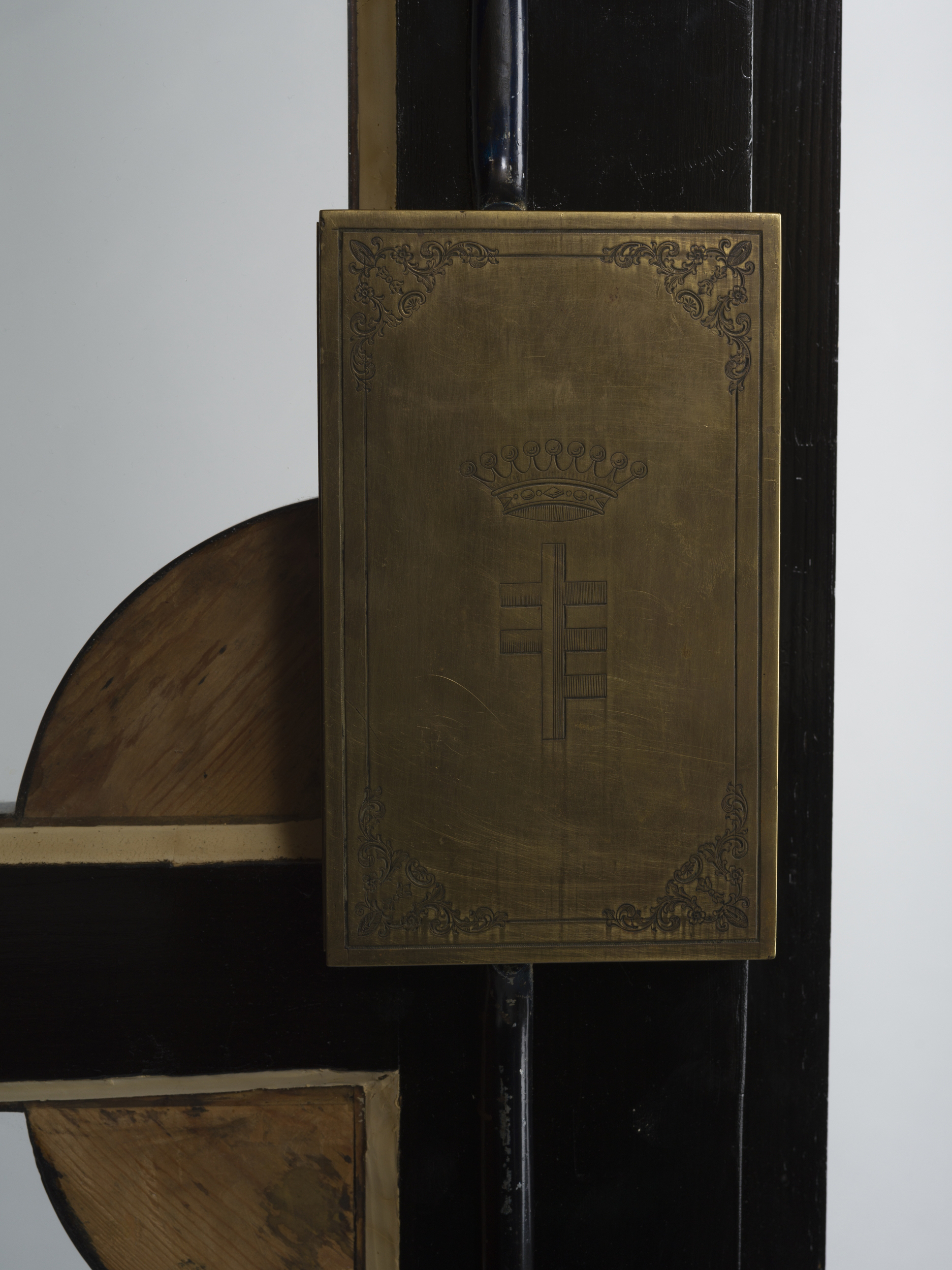 drewno; szylkret; mosiądz; brąz; aksamit; szkło przezroczyste
