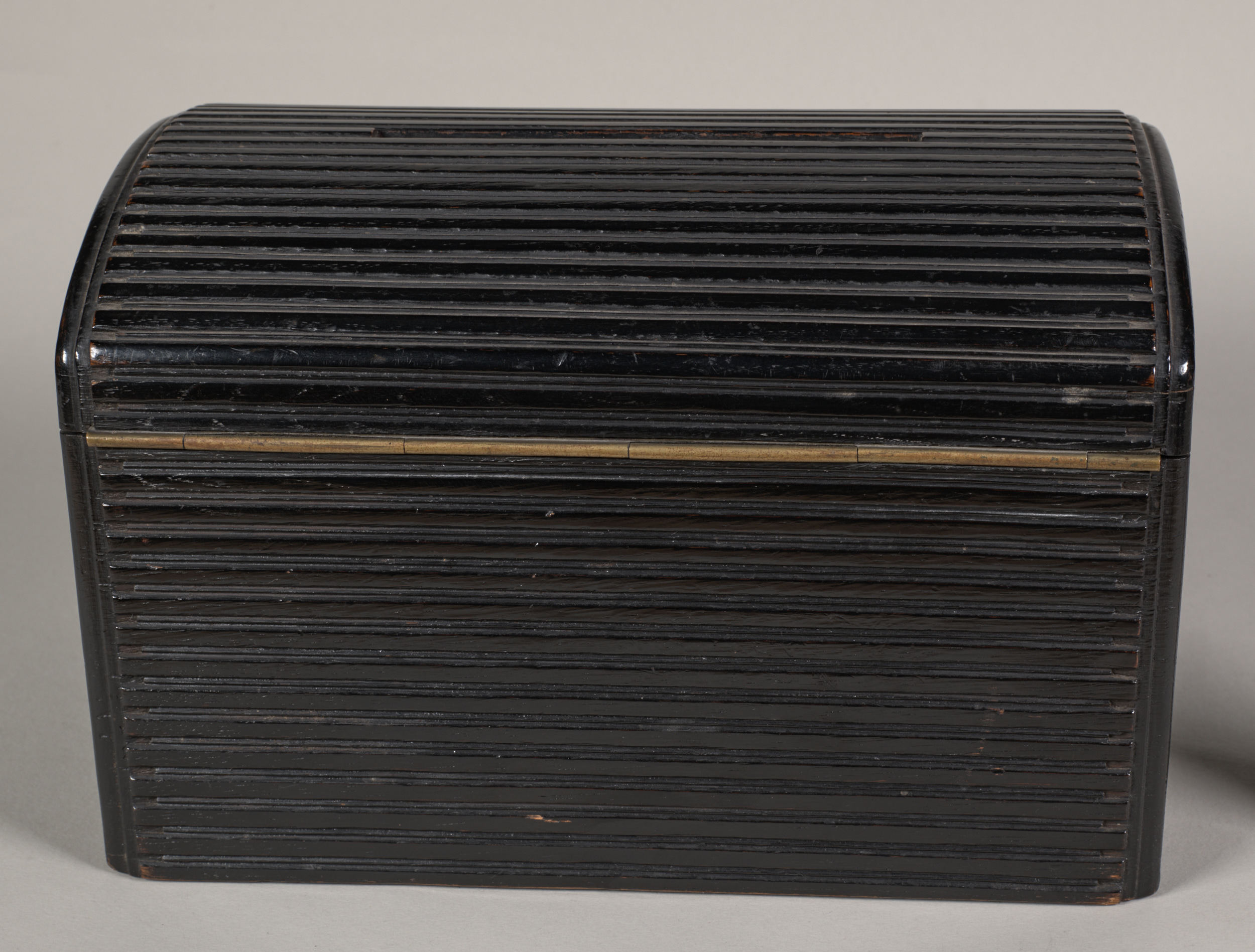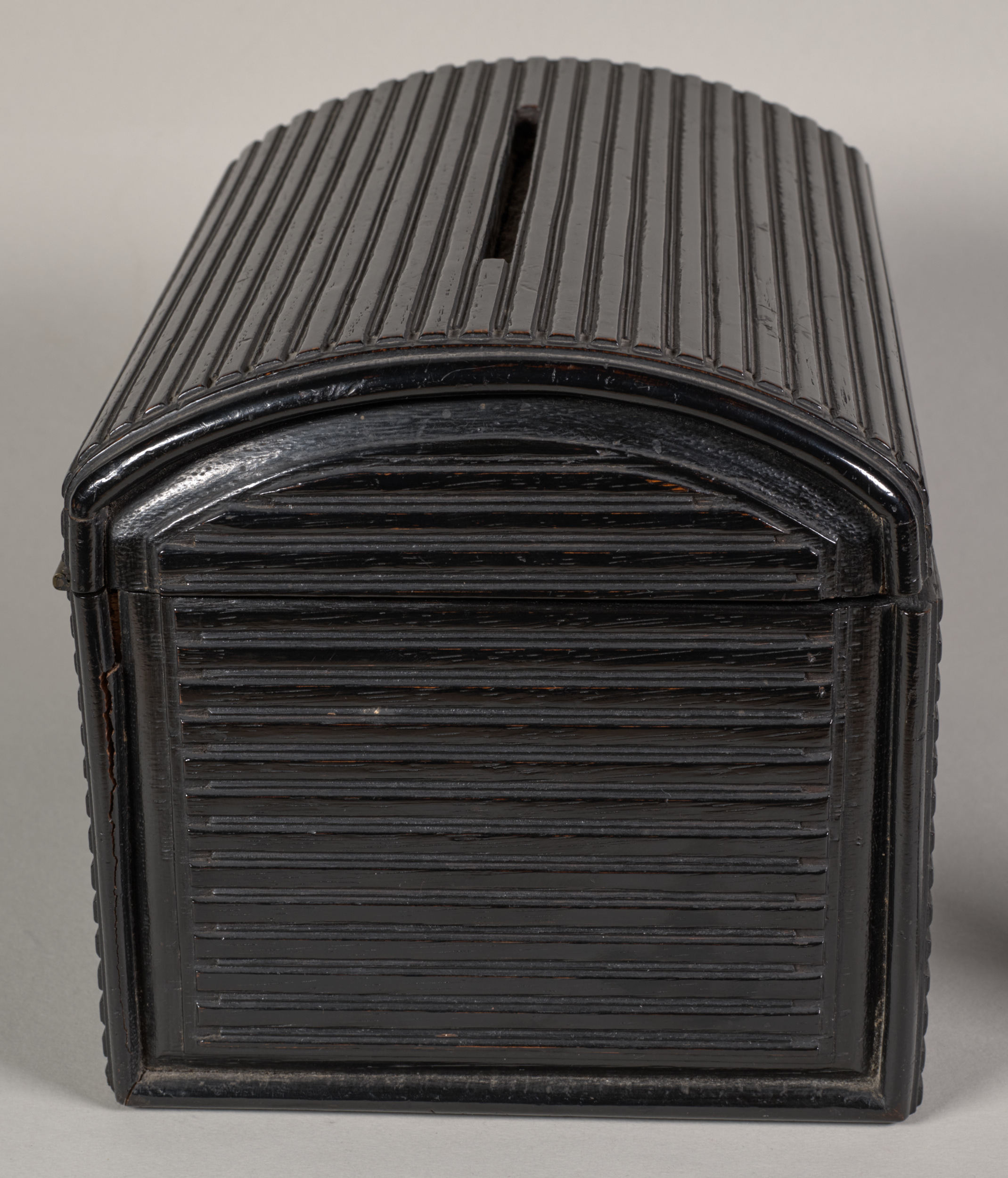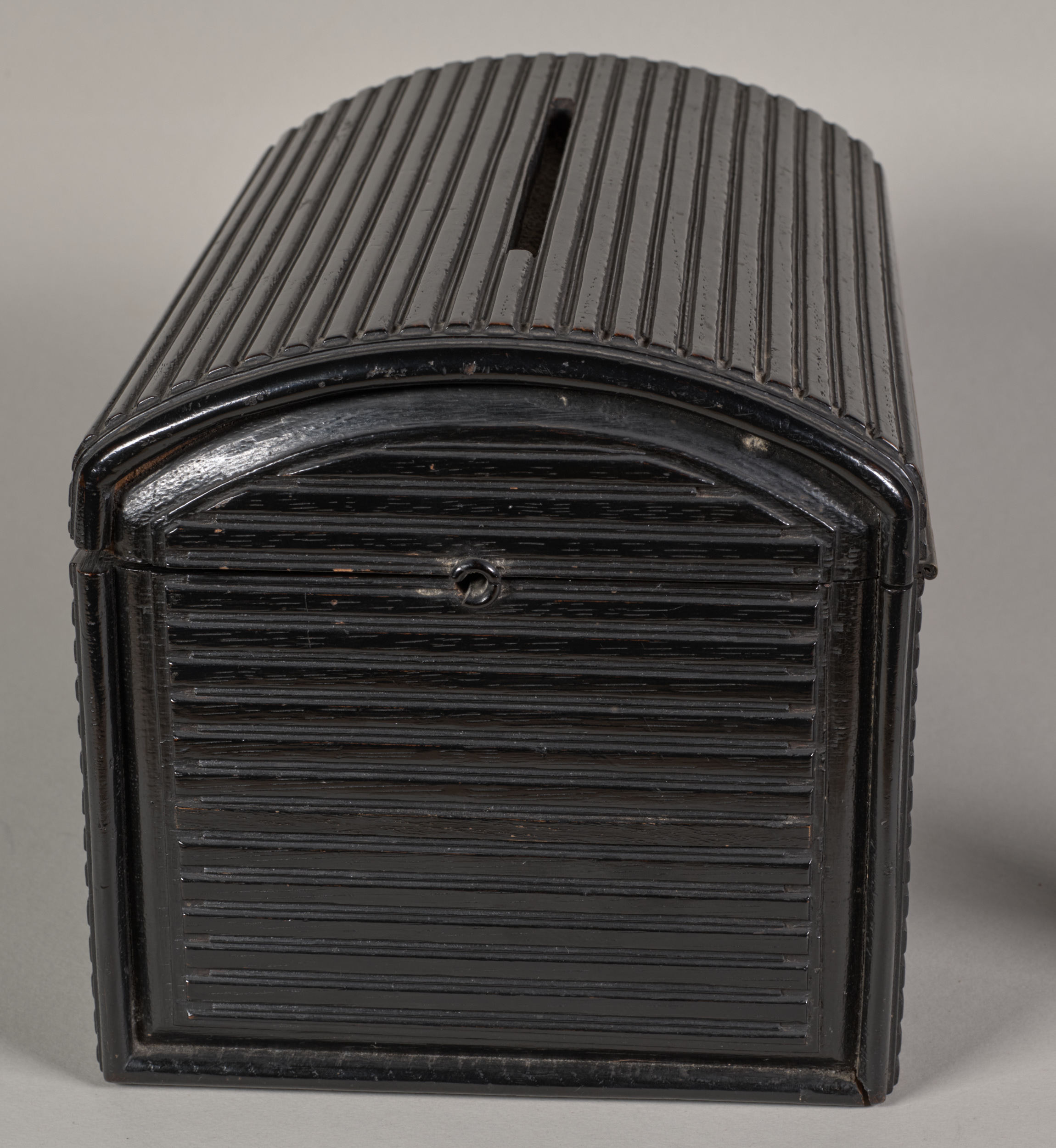 Kasetka drewniana – prostopadłościenna, ozdobna skrzynka, z wyraźnie wyoblonym wiekiem, wykonana na przełomie XIX i XX w. jako niewielki, praktyczny bibelot na biurko. Jej forma stylizowana jest na kufer podróżny. Boczne ścianki i wieko zdobione wąskimi, poziomymi szczeblinami o profilu półwałka, polichromowane na czarno. Na grzbiecie wieczka długa szczelina wrzutowa. Podstawa podklejona ciemnozielonym suknem. Wewnątrz kasety wyściółka z jasnoczerwonego aksamitu. Wieczko uchylne jednoskrzydłowe, na pasowym zawiasie mosiężnym zamocowanym wzdłuż długiej krawędzi skrzynki. Zamek mosiężny, górny wpust, z szyldem na frontowej ściance, metalowym, owalnym, malowanym na czarno.