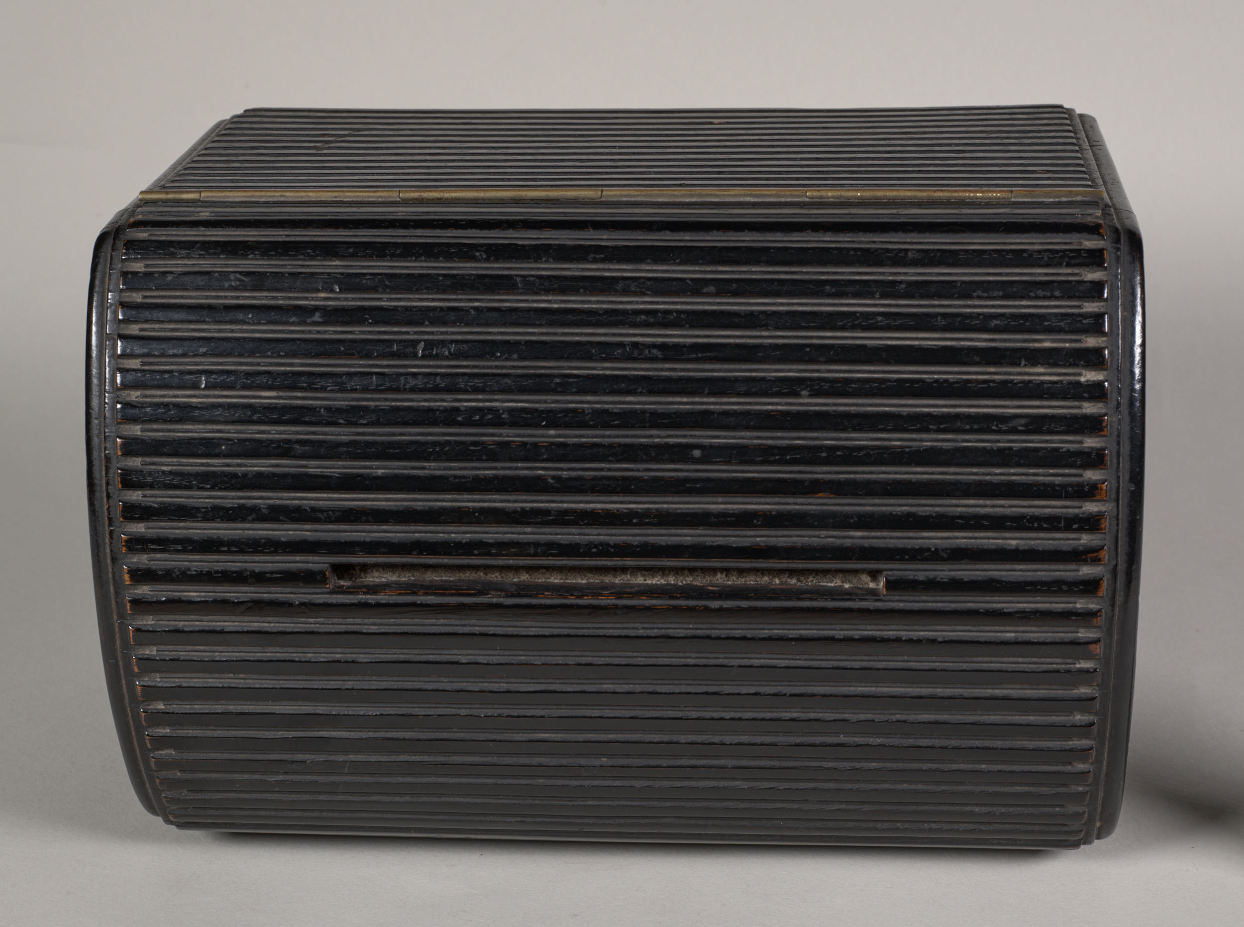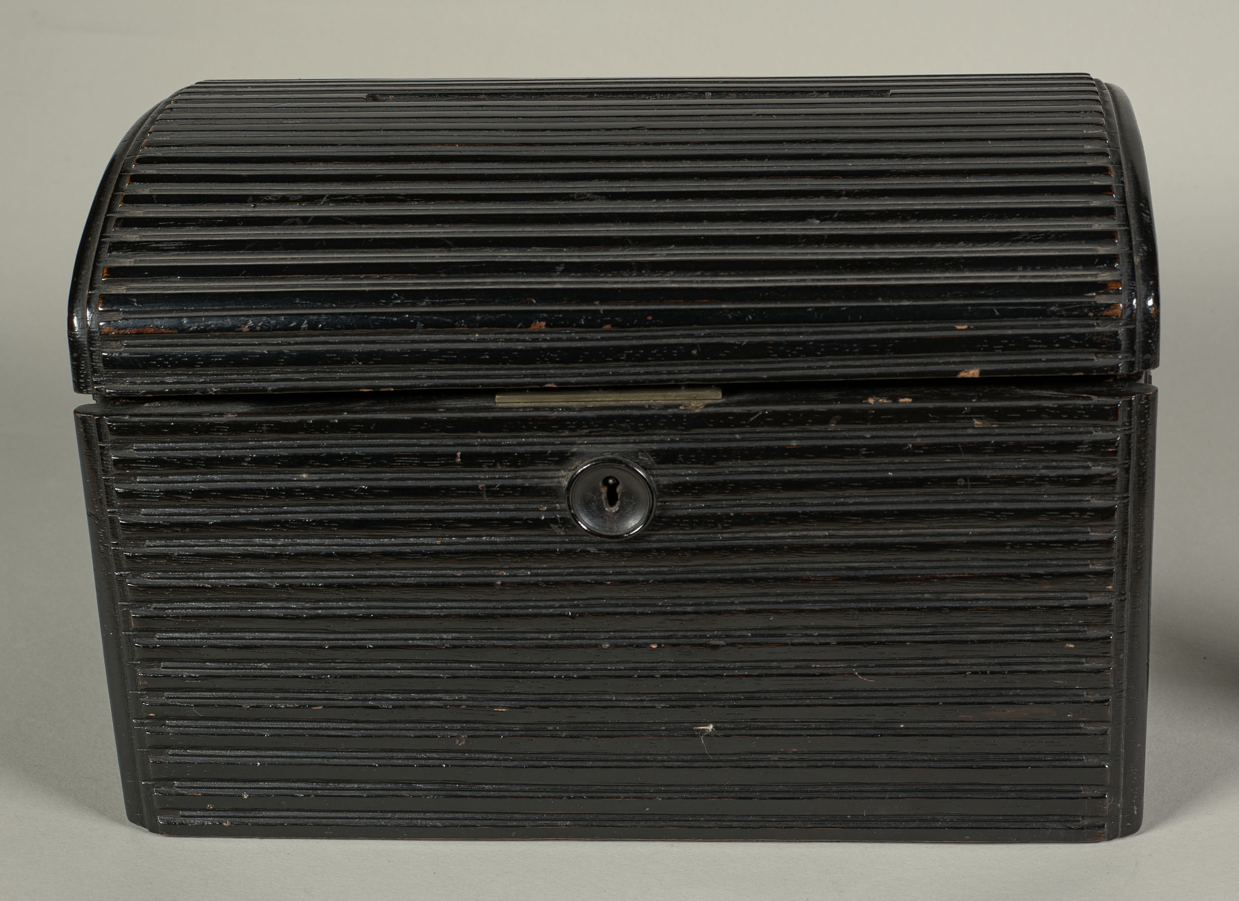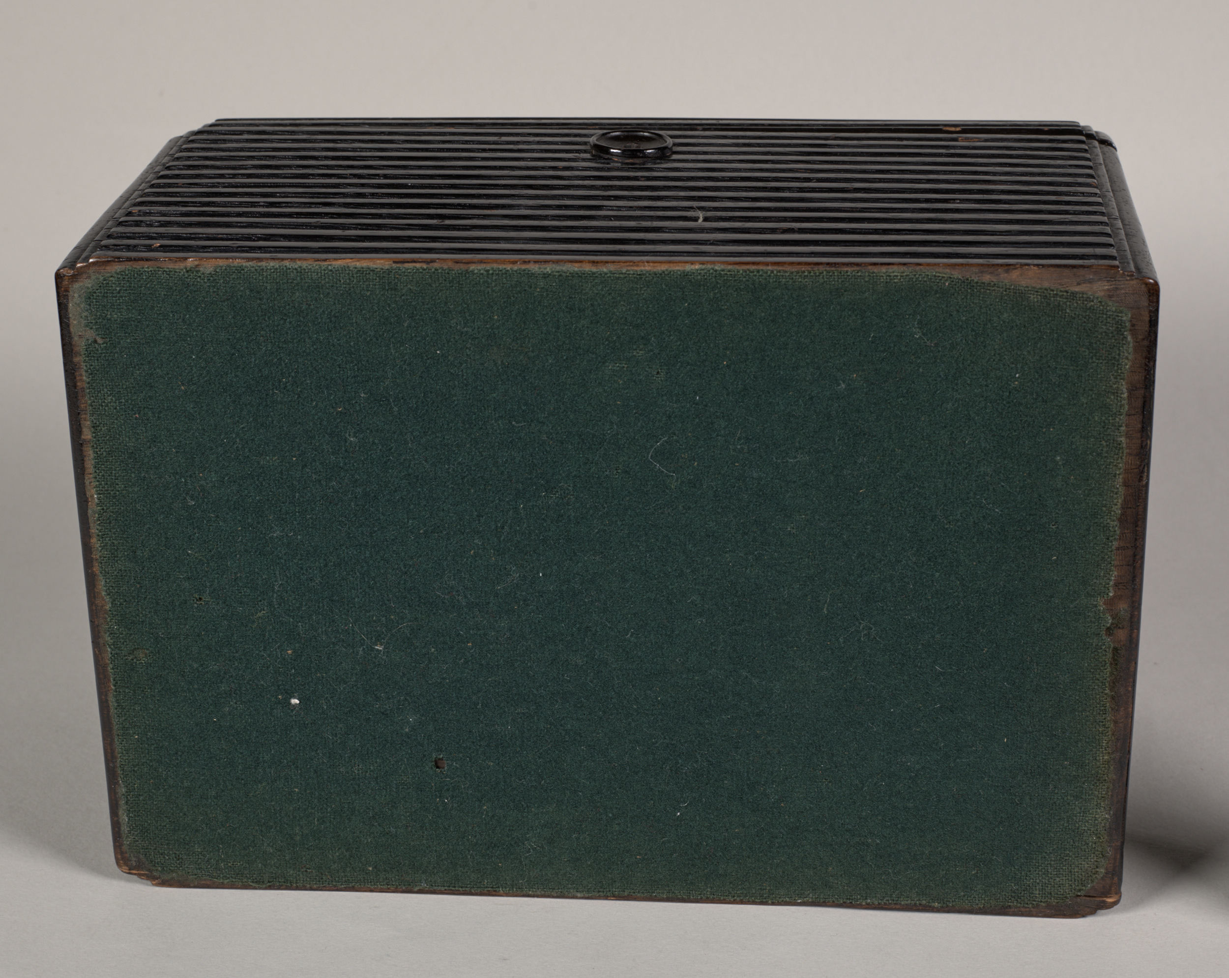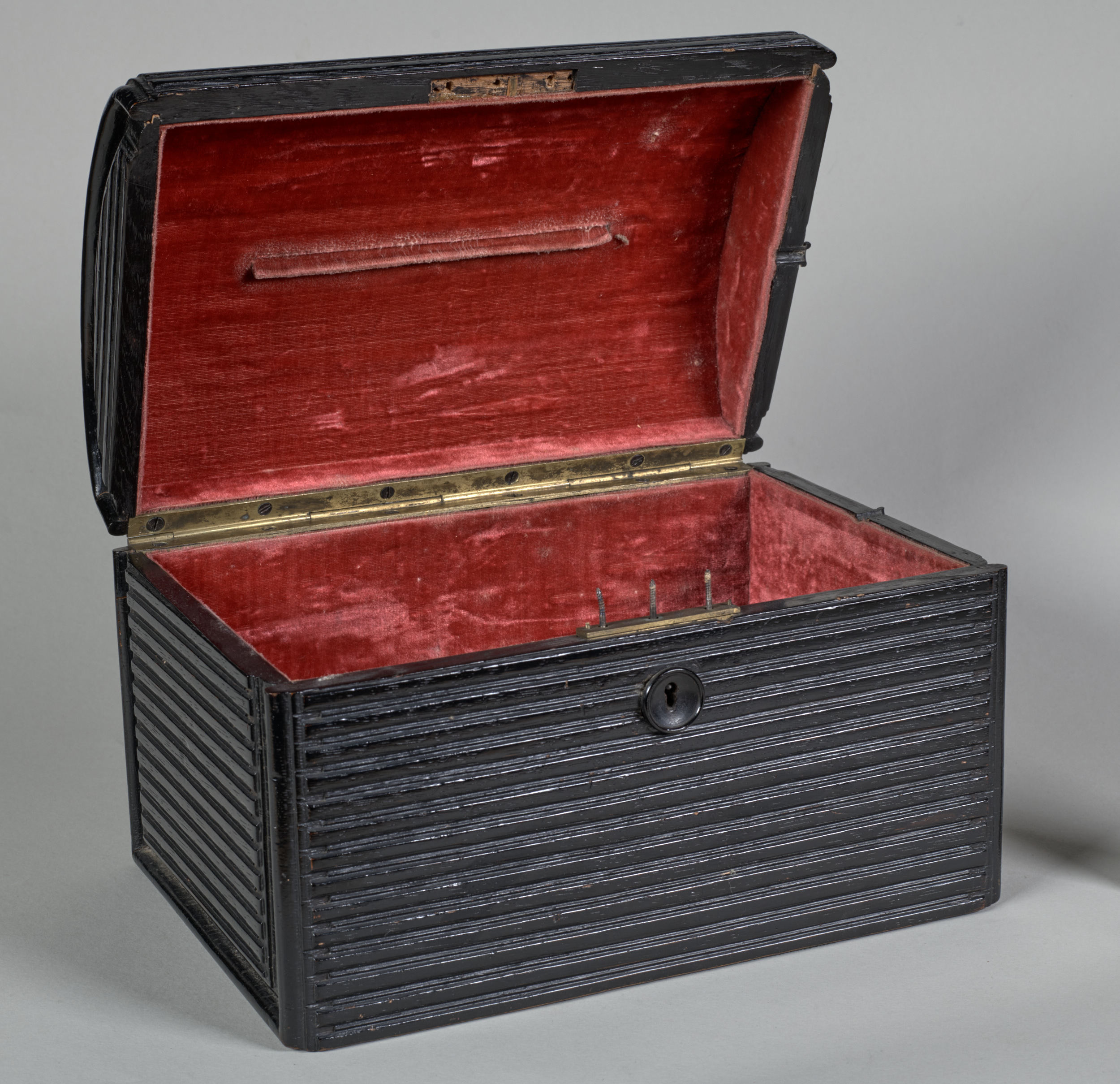 Kasetka drewniana – prostopadłościenna, ozdobna skrzynka, z wyraźnie wyoblonym wiekiem, wykonana na przełomie XIX i XX w. jako niewielki, praktyczny bibelot na biurko. Jej forma stylizowana jest na kufer podróżny. Boczne ścianki i wieko zdobione wąskimi, poziomymi szczeblinami o profilu półwałka, polichromowane na czarno. Na grzbiecie wieczka długa szczelina wrzutowa. Podstawa podklejona ciemnozielonym suknem. Wewnątrz kasety wyściółka z jasnoczerwonego aksamitu. Wieczko uchylne jednoskrzydłowe, na pasowym zawiasie mosiężnym zamocowanym wzdłuż długiej krawędzi skrzynki. Zamek mosiężny, górny wpust, z szyldem na frontowej ściance, metalowym, owalnym, malowanym na czarno.