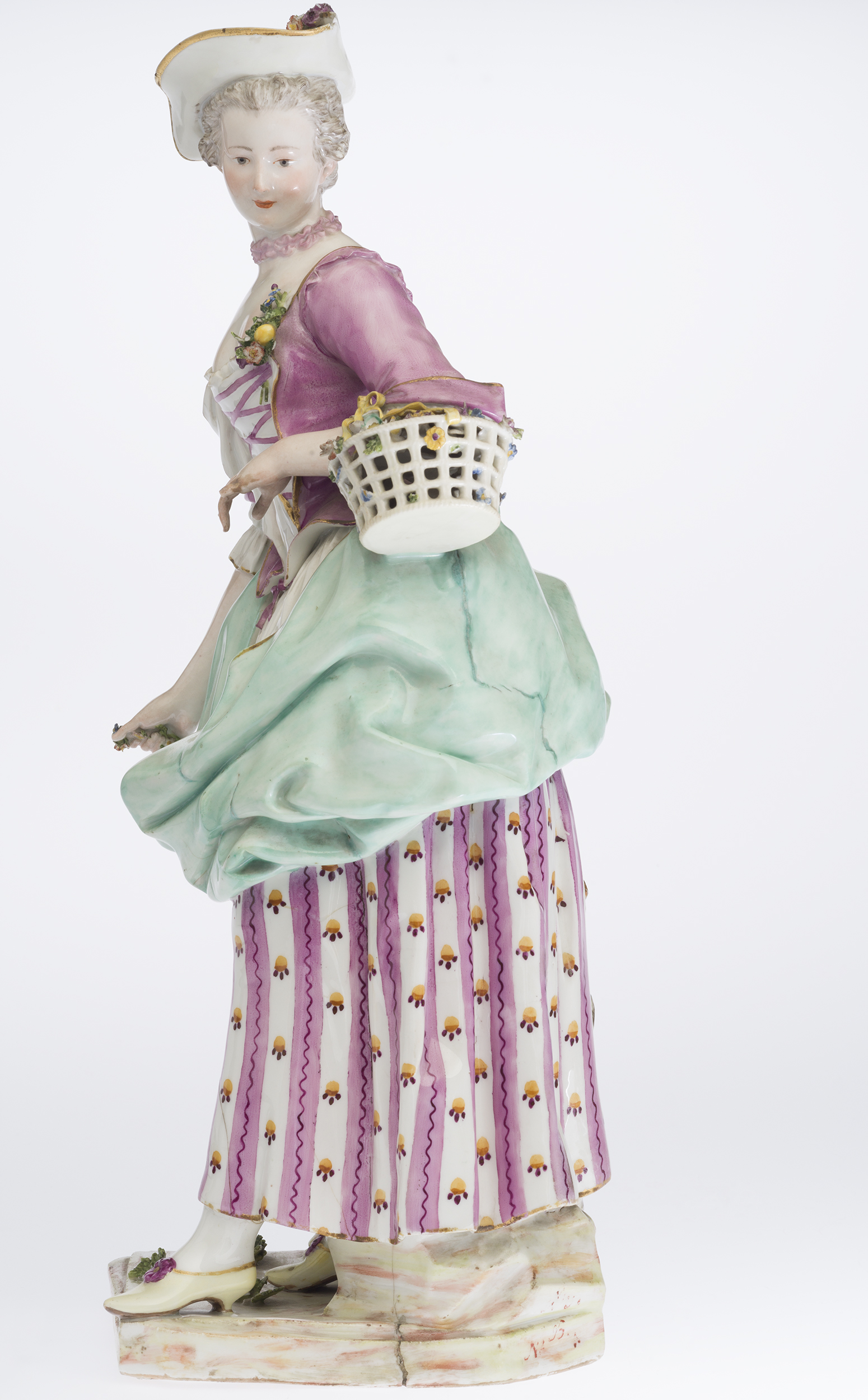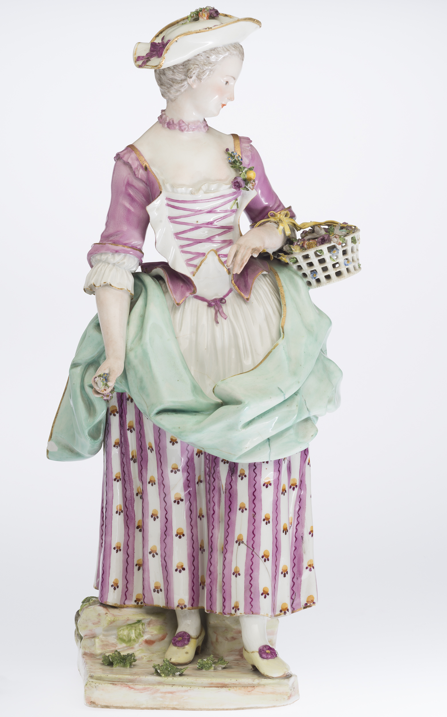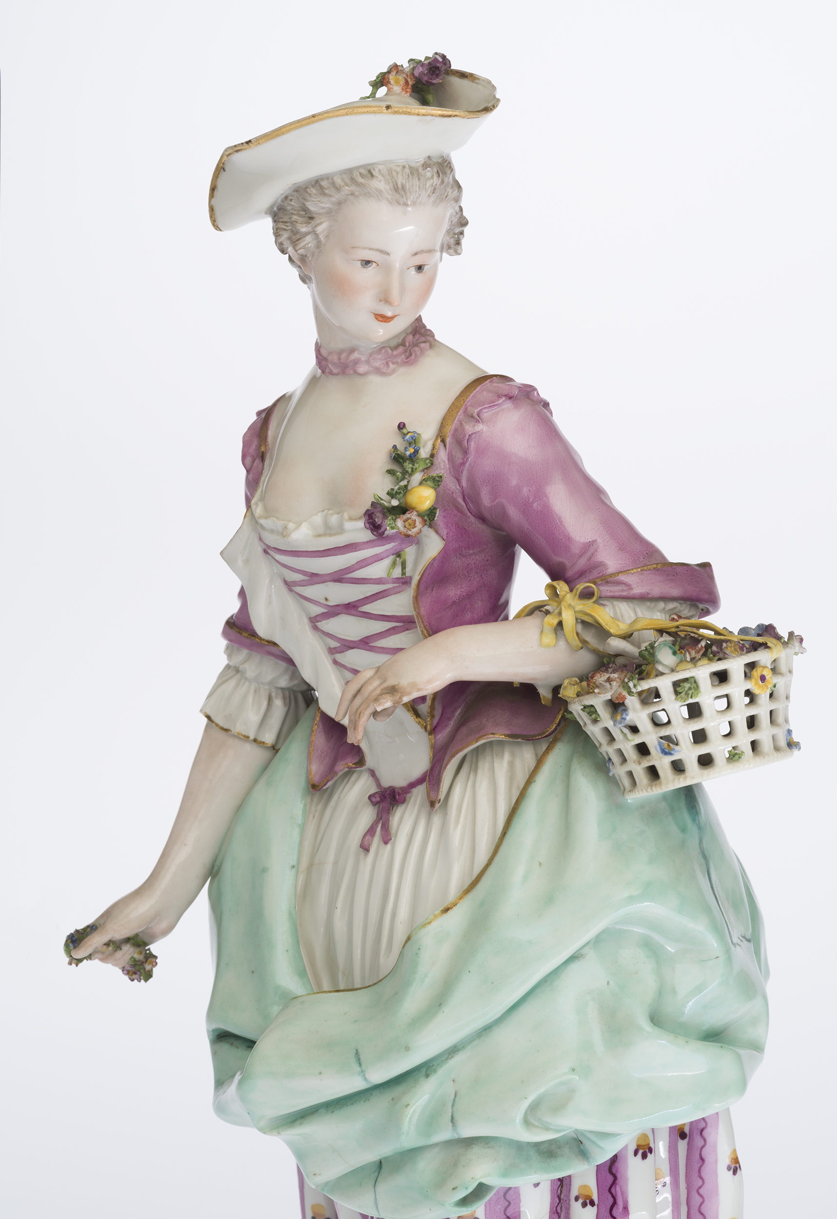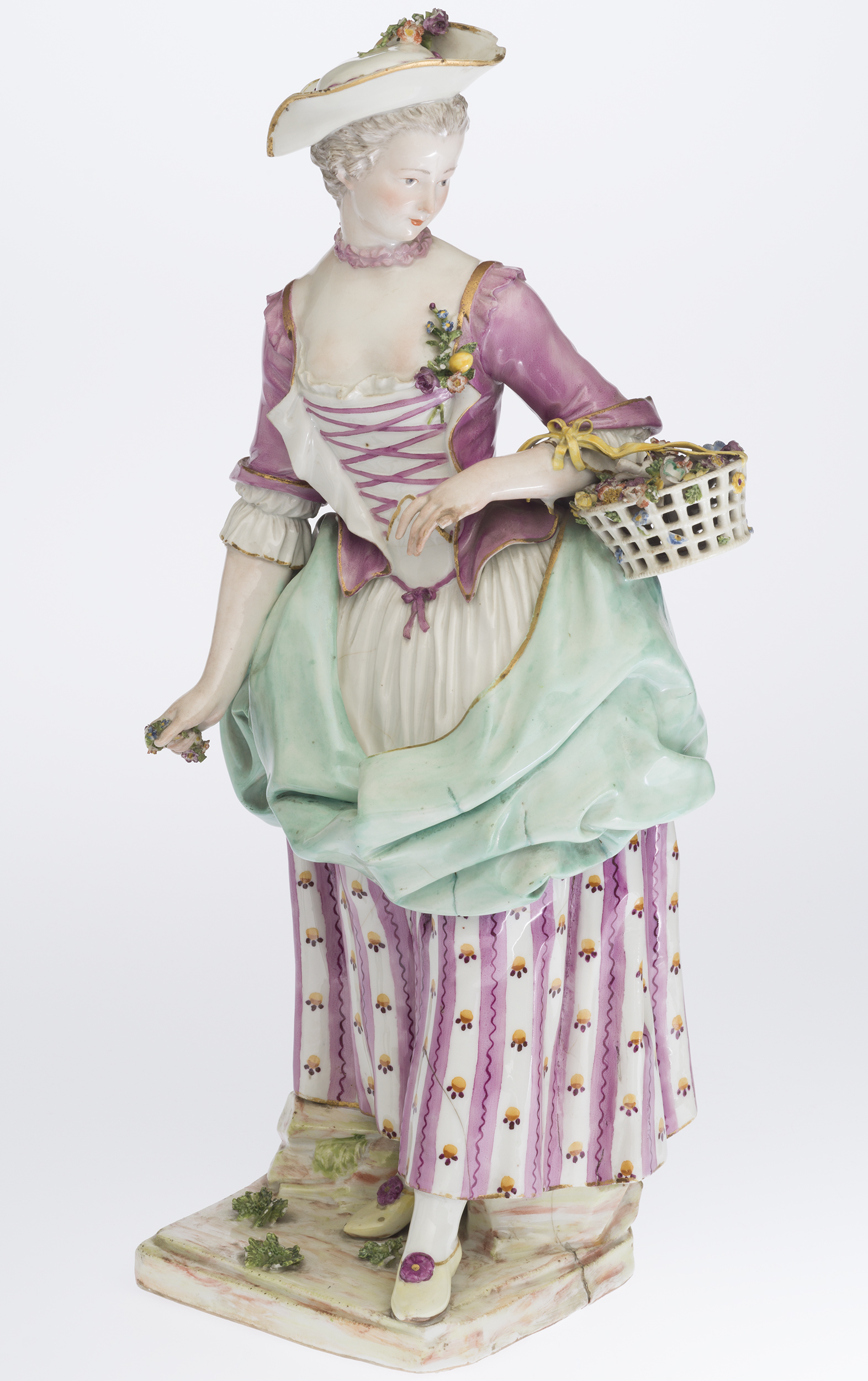 Figurka nazywana kwiaciarką czy też ogrodniczką stanowi rzadki przykład przedmiotu, którego historia związana z pałacem wilanowskim jest dokładnie udokumentowana. Pełną wdzięku postać zakupił w 1800 roku Stanisław Kostka Potocki. Nowy właściciel pałacu wilanowskiego chciał uzupełnić jego wyposażenie uszczuplone po wyprowadzce poprzedniej właścicielki i jego teściowej Izabeli Lubomirskiej, która zabrała wiele swoich przedmiotów do Łańcuta. Figurę, wraz ze stanowiącym do niej parę ogrodnikiem, udało mu się wylicytować, o czym świadczy zapis w jego "Pamiętniku Interessów": „Kupna na Tandecie po Rogalińskim ... 4 Figury Porcelany Saskiey do Wilanowa f 120”. Swoje działania opisuje także w liście do żony z 2 października 1800 roku: „Kupiłem także ze trzy figlów z porcelany saskiey za bezcen, nie ładnych, mais tels qu’ils faut pour remplacer ces qui sontpassé de Wilanów a Łańcut [lecz takich, których trzeba, aby zastąpiły te, które przeszły z Wilanowa do Łańcuta]”. „Nikt ich nie licytował tylko ja i Niemcy, je crains qu’un grand berger et sa tendre compagne ne m’echappent [boję się, że wielki pasterz i jego czuła towarzyszka uciekną mi], bo się w nich szalenie jeden Prusak zakochał, są to machiny wielkie, propres a remplacer [mogące zastąpić] ów wiatrak z Porcelany a nawet y św. Jana...”
