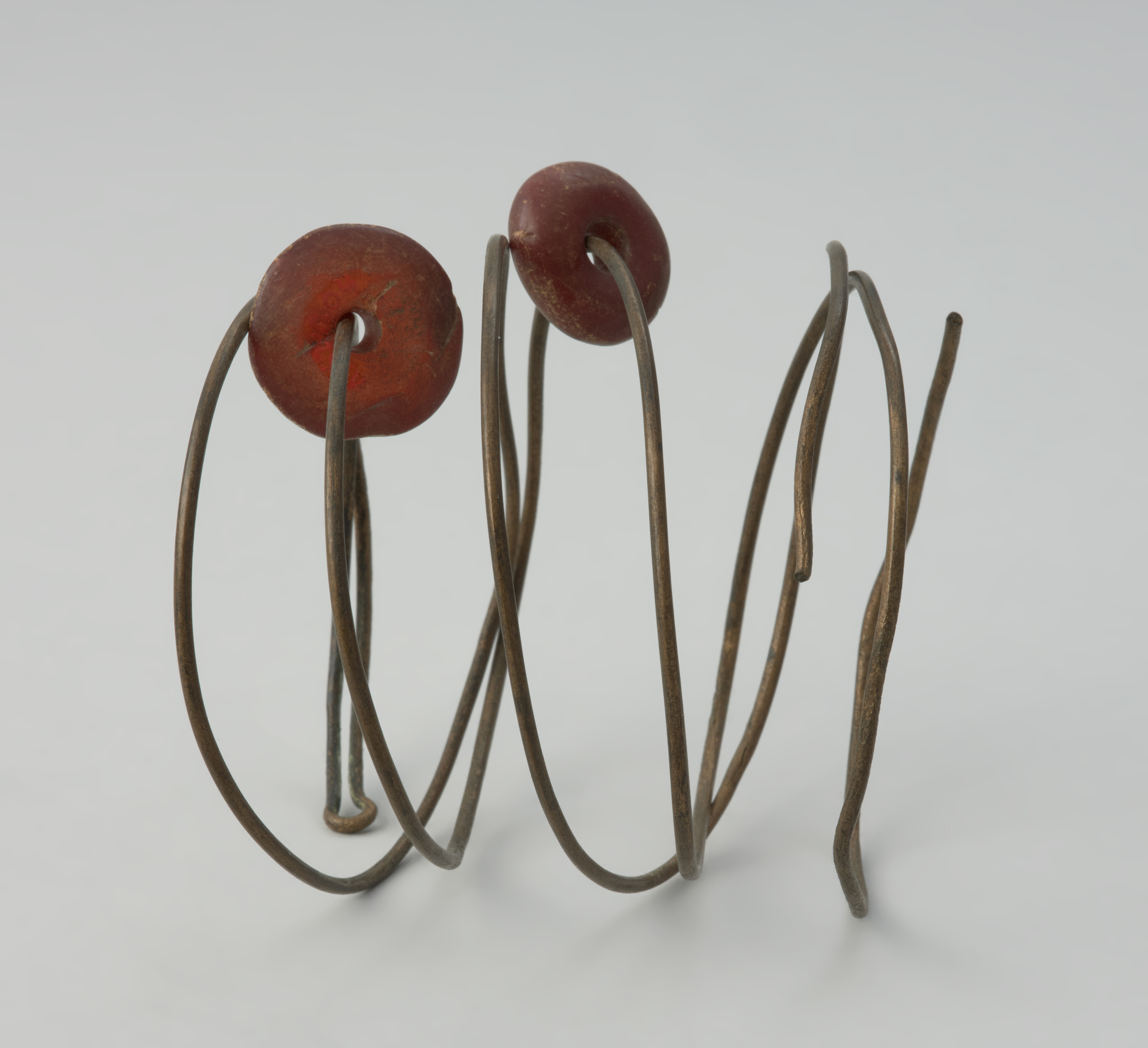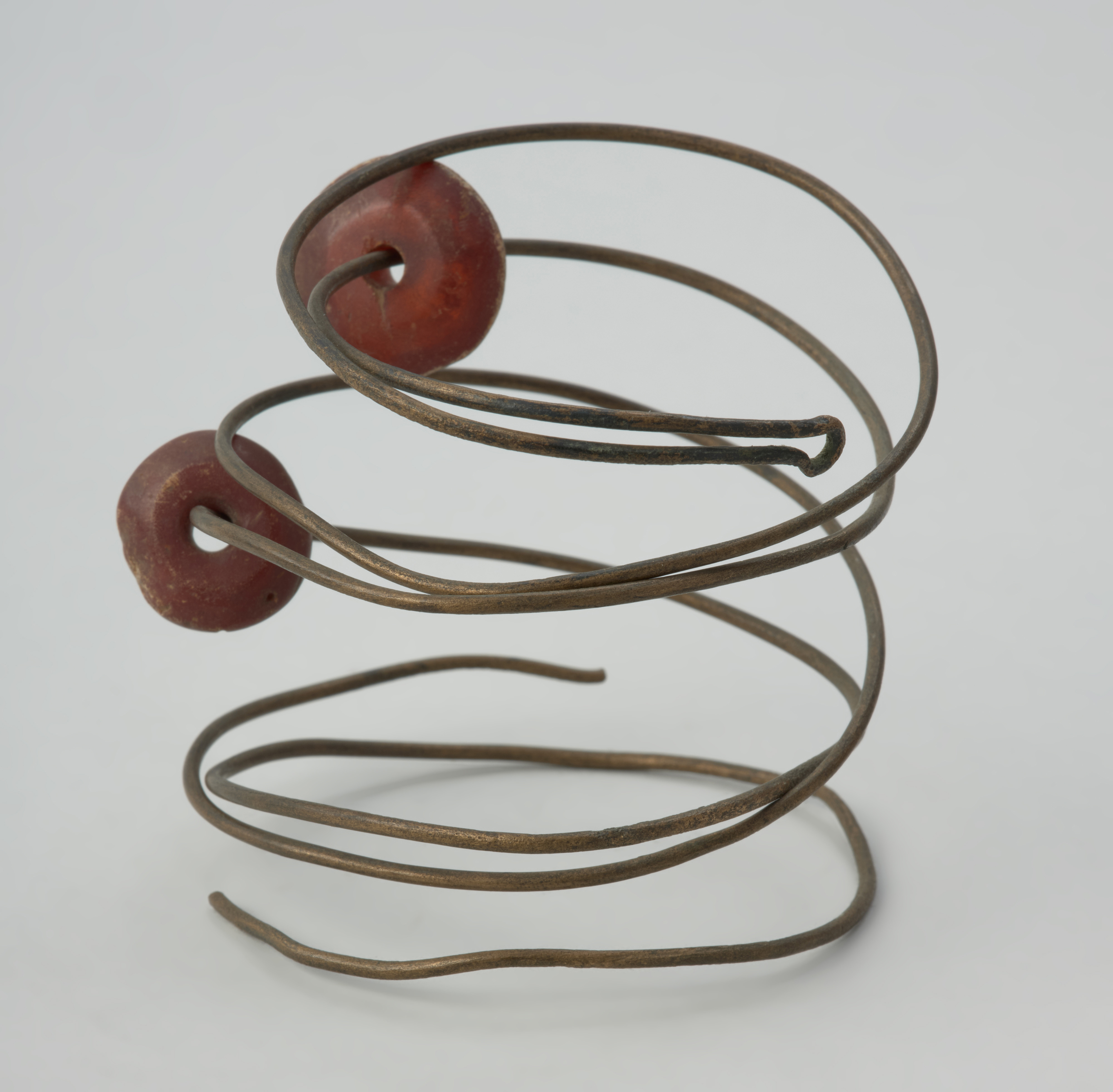 Spirala z brązu jest częścią znalezionego w torfie skarbu, który zawierał również drugą spiralę, brązowe kółko, druciki oraz fragmenty prętów, który można datować na młodszą epokę brązu (ok. 900–750 p.n.e.). Na trzyzwojową spiralę z cienkiego brązowego drutu są nawleczone dwa bursztynowe paciorki. Bursztyn, jako surowiec do wyrobu ozdób był niezwykle ważny w epoce brązu. Analiza przedmiotów z bursztynu odkrytych w mykeńskich grobach datowanych na 1600 rok p.n.e. i lata późniejsze dowiodła, że pochodzi on z obszaru Morza Bałtyckiego. Uwzględniając dużą liczbę znalezisk z regionu Morza Egejskiego można wysunąć przypuszczenie o istnieniu rozwiniętego handlu ze Skandynawią już w starszym okresie epoki brązu. Pod koniec epoki brązu dostawy kruszcu z Jutlandii zanikły. Przypuszcza się, że w tym okresie to mieszkańcy południowego wybrzeża Morza Bałtyckiego zaczęli handlować bursztynem. Surowiec eksportowano na tereny Europy Zachodniej, gdzie najprawdopodobniej wymieniano go na metal. Świadczą o tym typowe dla tych terenów przedmioty oraz duża zawartość ołowiu w stopie brązu na osadach z okolic Pruszcza. Z południem Europy rozpoczęto handel w okresie halsztackim C, co potwierdzają m.in. pochodzące z Italii oraz obszaru alpejskiego przedmioty, które odkryto na jednej z osad w Wielkopolsce. Na ziemiach polskich wyroby z bursztynu postrzegano jako dobro luksusowe oraz symbol statusu. Większość znalezisk (głównie w formie paciorków, fragmentów kolii) pochodzi z bogato wyposażonych grobów.