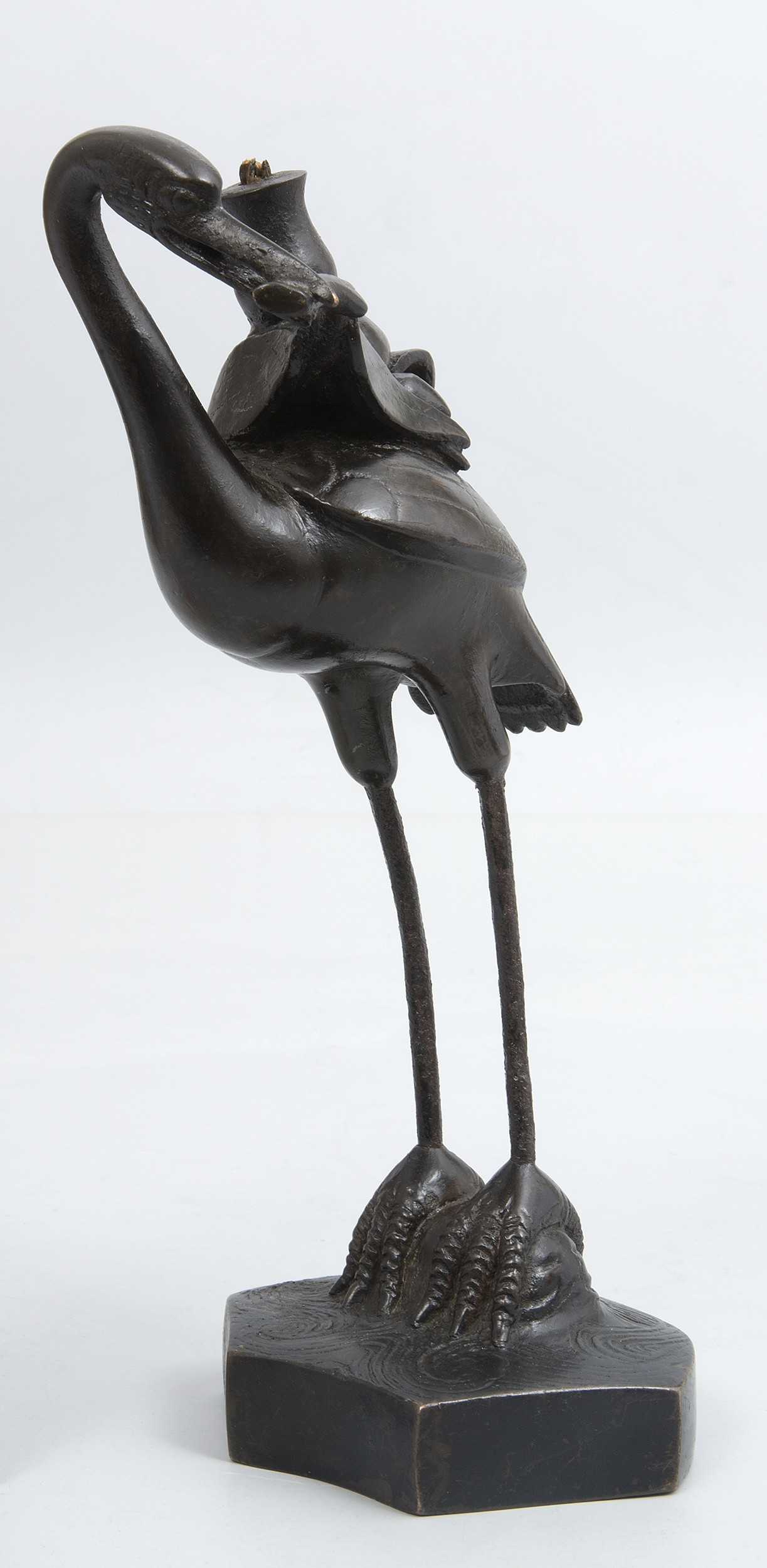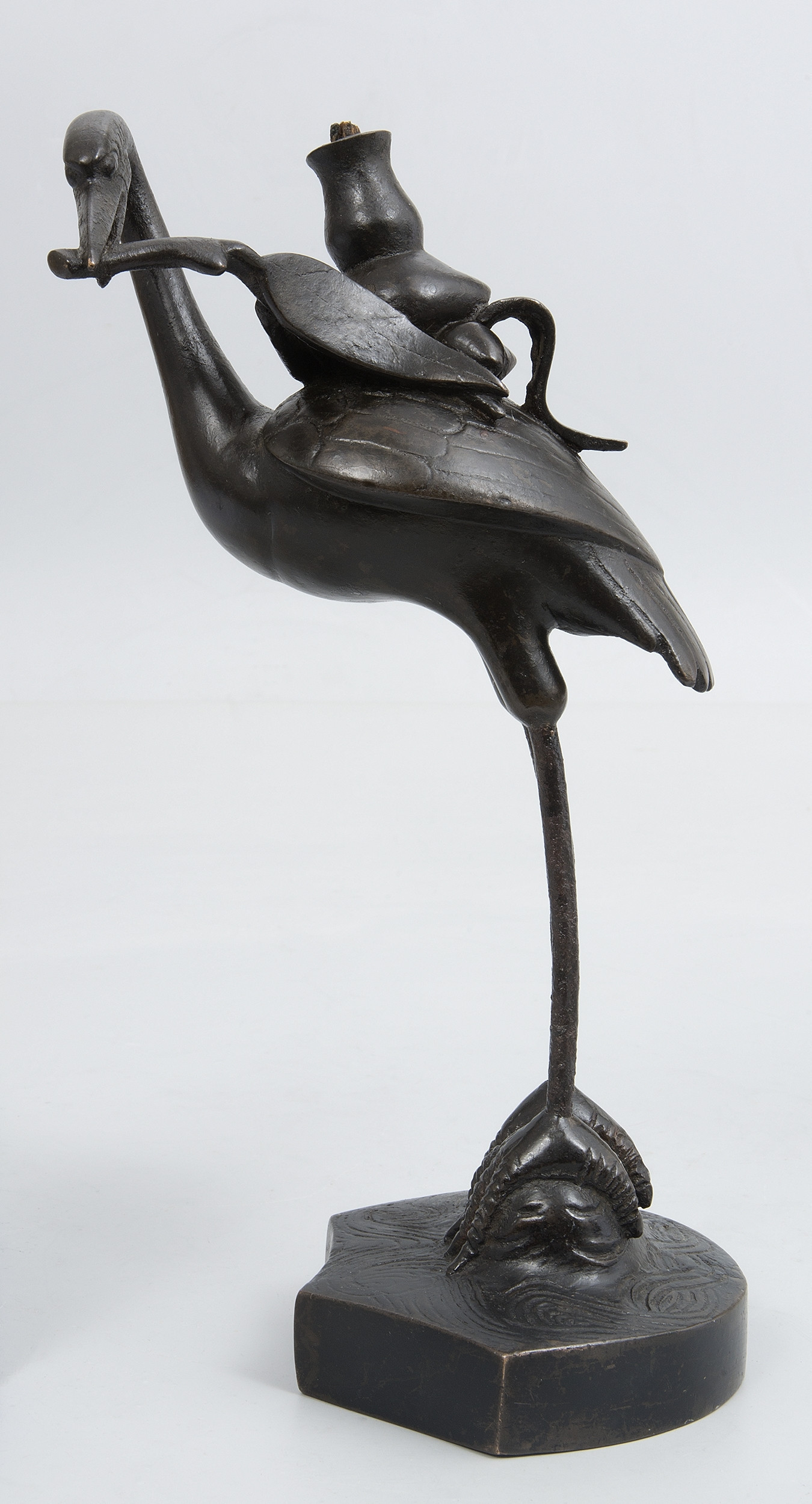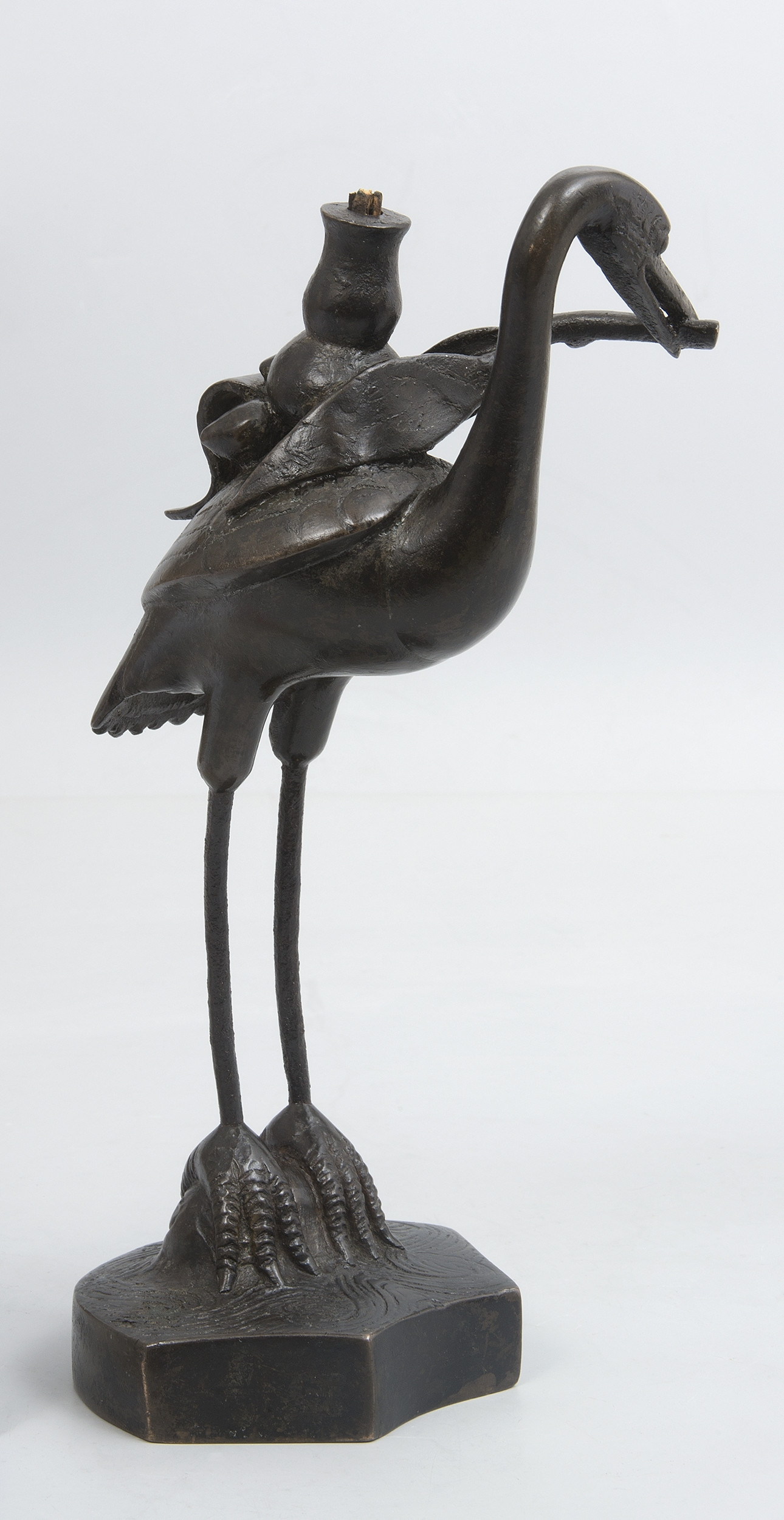 Świecznik w kształcie żurawia z gałązką brzoskwini w dziobie. Smukła figura ptaka została osadzona na niewielkiej, grawerowanej od góry podstawce. Na plecach żurawia znajduje się niewielka tulejka do osadzenia kadzidła, nie zachowała się profitka.